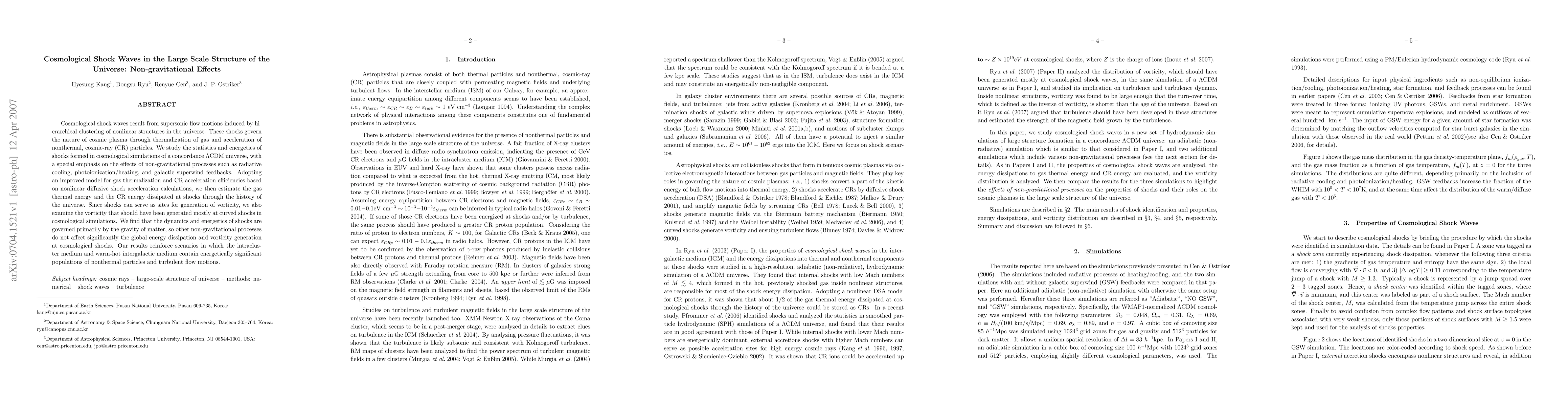This paper investigates cosmological shock waves from supersonic flows in the universe, focusing on their role in thermalizing gas and accelerating cosmic rays. It finds that while non-gravitational processes like radiative cooling and galactic superwinds occur, they do not significantly impact the global energy dissipation and vorticity generation at cosmological shocks, which are primarily driven by gravity.