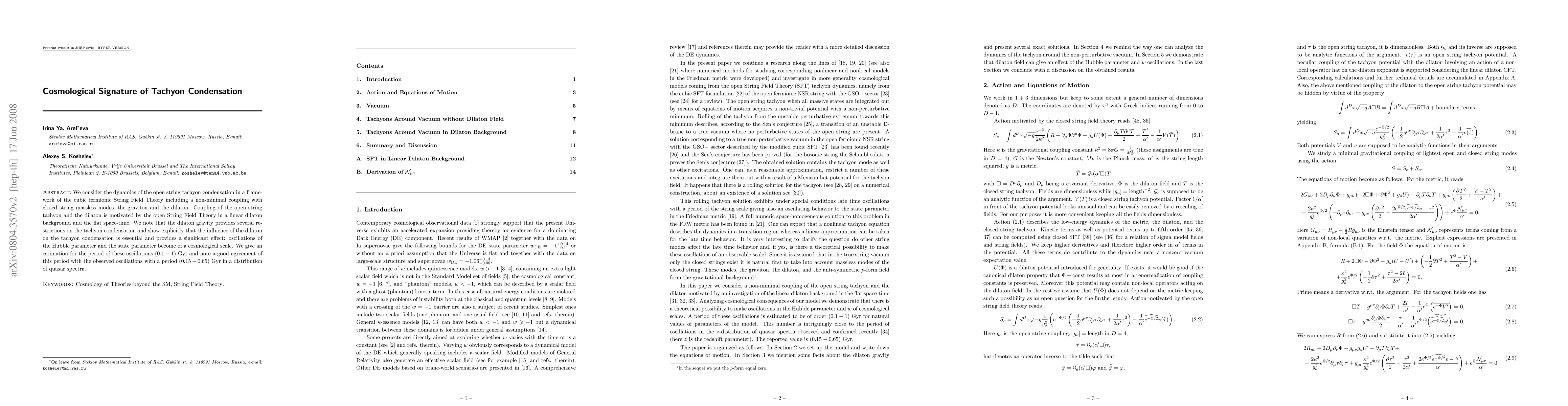 This paper explores the dynamics of open string tachyon condensation in cubic fermionic String Field Theory, emphasizing the non-minimal coupling with the graviton and dilaton. The study finds that the dilaton's influence on tachyon condensation leads to significant cosmological effects, including oscillations of the Hubble parameter and state parameter, with periods matching observed quasar spectrum oscillations.