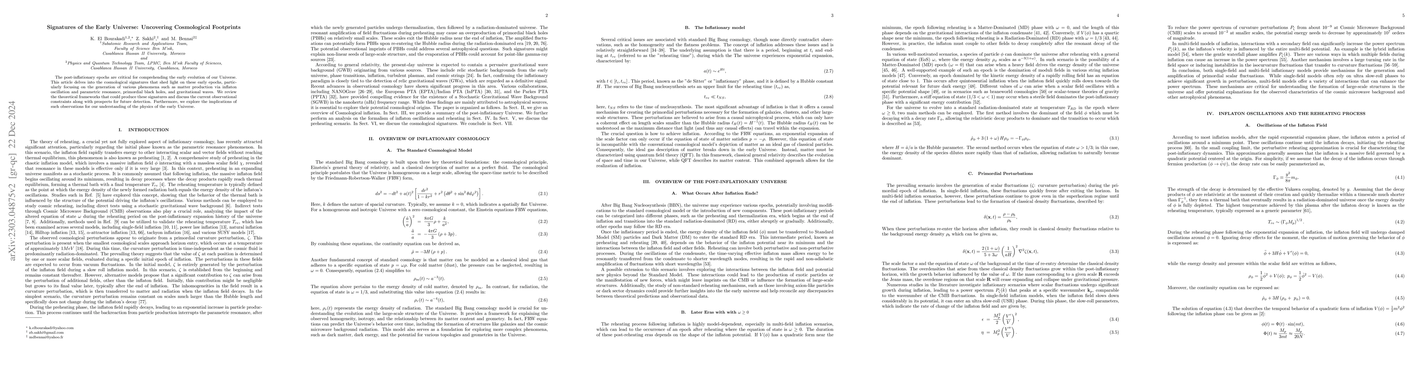 This paper investigates cosmological signatures from the post-inflationary epochs, focusing on phenomena like inflaton oscillation-driven matter production, primordial black holes, and gravitational waves. It reviews theoretical mechanisms and discusses observational constraints and future detection prospects, highlighting implications for fundamental physics and early Universe evolution.