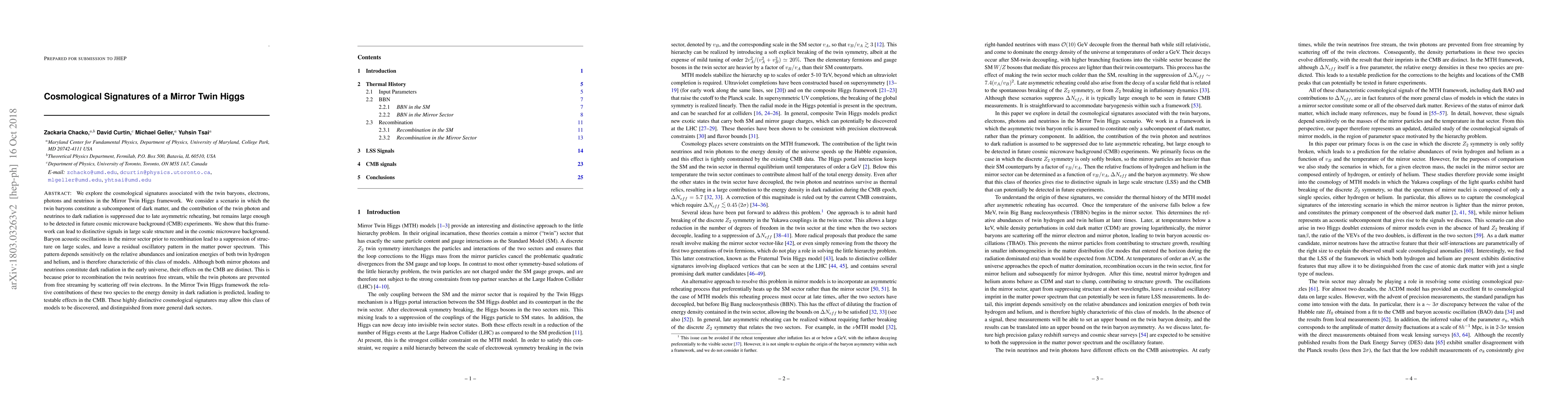 We explore the cosmological signatures associated with the twin baryons, electrons, photons and neutrinos in the Mirror Twin Higgs framework. We consider a scenario in which the twin baryons constitute a subcomponent of dark matter, and the contribution of the twin photon and neutrinos to dark radiation is suppressed due to late asymmetric reheating, but remains large enough to be detected in future cosmic microwave background (CMB) experiments. We show that this framework can lead to distinctive signals in large scale structure and in the cosmic microwave background. Baryon acoustic oscillations in the mirror sector prior to recombination lead to a suppression of structure on large scales, and leave a residual oscillatory pattern in the matter power spectrum. This pattern depends sensitively on the relative abundances and ionization energies of both twin hydrogen and helium, and is therefore characteristic of this class of models. Although both mirror photons and neutrinos constitute dark radiation in the early universe, their effects on the CMB are distinct. This is because prior to recombination the twin neutrinos free stream, while the twin photons are prevented from free streaming by scattering off twin electrons. In the Mirror Twin Higgs framework the relative contributions of these two species to the energy density in dark radiation is predicted, leading to testable effects in the CMB. These highly distinctive cosmological signatures may allow this class of models to be discovered, and distinguished from more general dark sectors.