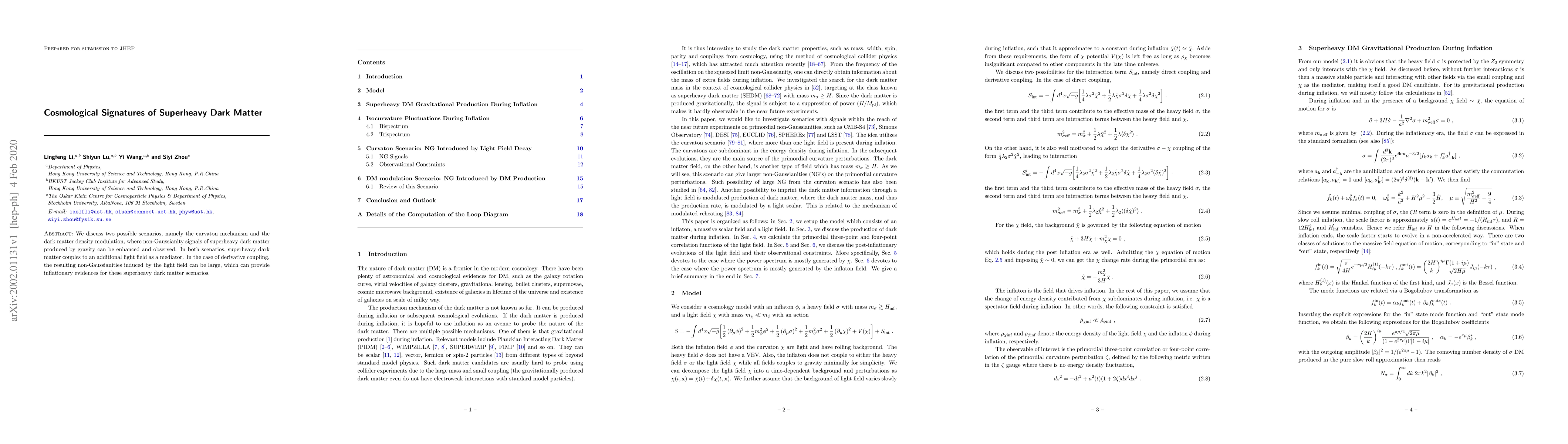 This paper explores cosmological signatures of superheavy dark matter via two mechanisms—the curvaton model and dark matter density modulation—where enhanced non-Gaussianity signals, potentially detectable in inflationary contexts, are generated through coupling with a light field mediator. The study emphasizes the possibility of significant non-Gaussianities from derivative coupling.