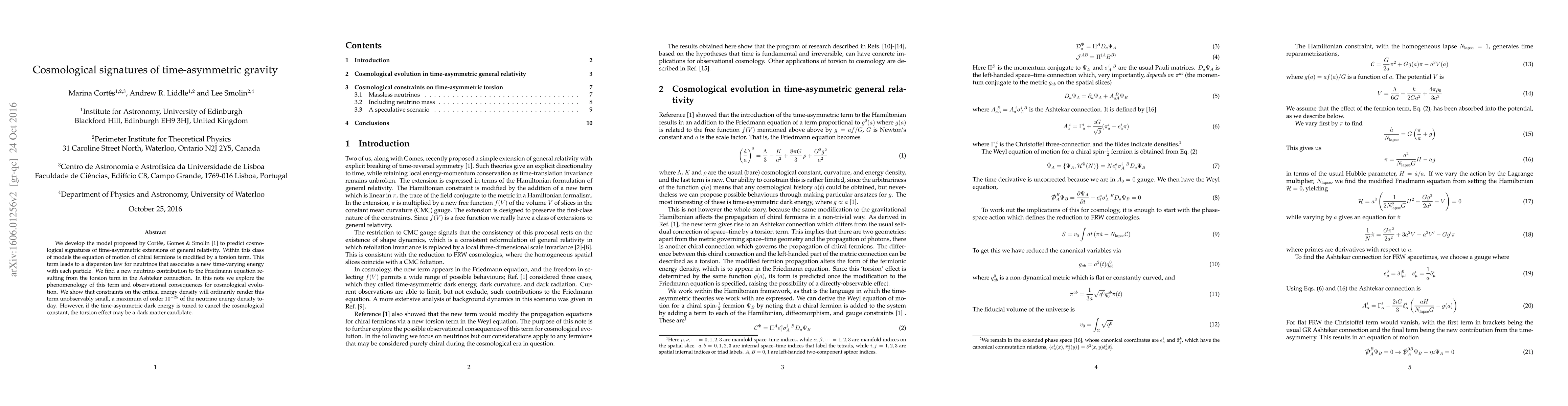 We develop the model proposed by Cort\^es, Gomes & Smolin, to predict cosmological signatures of time-asymmetric extensions of general relativity they proposed recently. Within this class of models the equation of motion of chiral fermions is modified by a torsion term. This term leads to a dispersion law for neutrinos that associates a new time-varying energy with each particle. We find a new neutrino contribution to the Friedmann equation resulting from the torsion term in the Ashtekar connection. In this note we explore the phenomenology of this term and observational consequences for cosmological evolution. We show that constraints on the critical energy density will ordinarily render this term unobservably small, a maximum of order $10^{-25}$ of the neutrino energy density today. However, if the time-asymmetric dark energy is tuned to cancel the cosmological constant, the torsion effect may be a dark matter candidate.