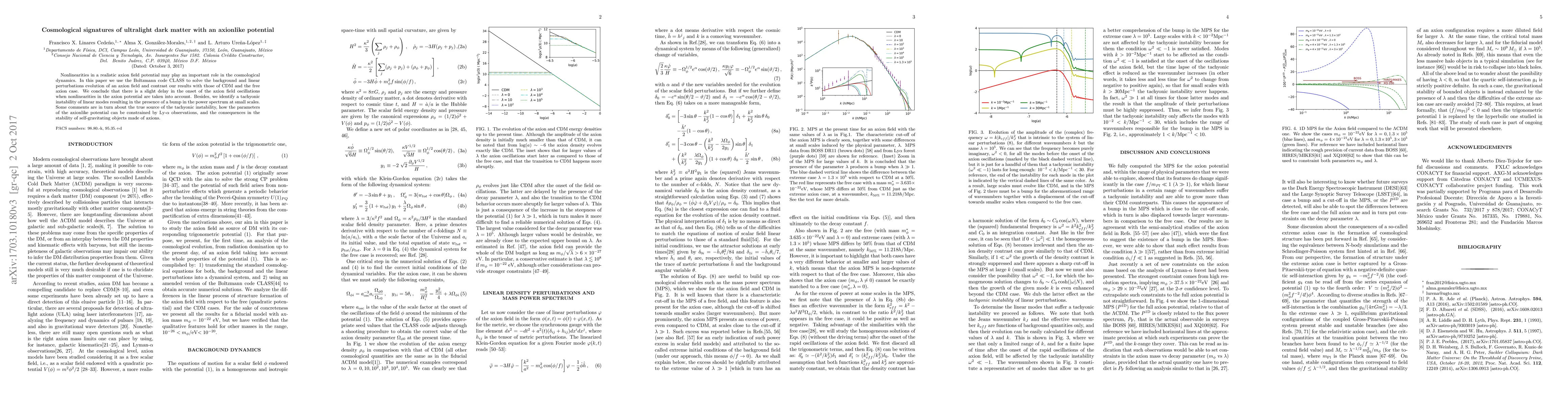 This paper explores how including nonlinearities in an axion field potential affects cosmological dynamics, finding a slight delay in oscillations and a tachyonic instability that can be detected in the power spectrum.