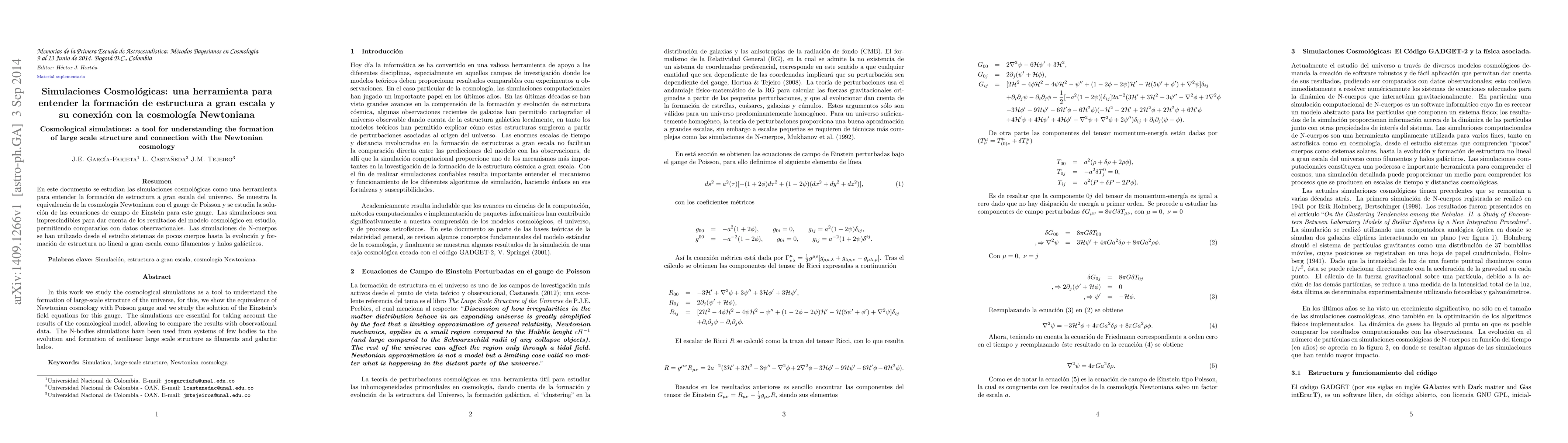 This paper explores cosmological simulations to understand the universe's large-scale structure, demonstrating the equivalence of Newtonian cosmology with the Poisson gauge and solving Einstein's field equations for this gauge. Simulations, from small systems to complex nonlinear structures, are crucial for comparing theoretical models with observational data.