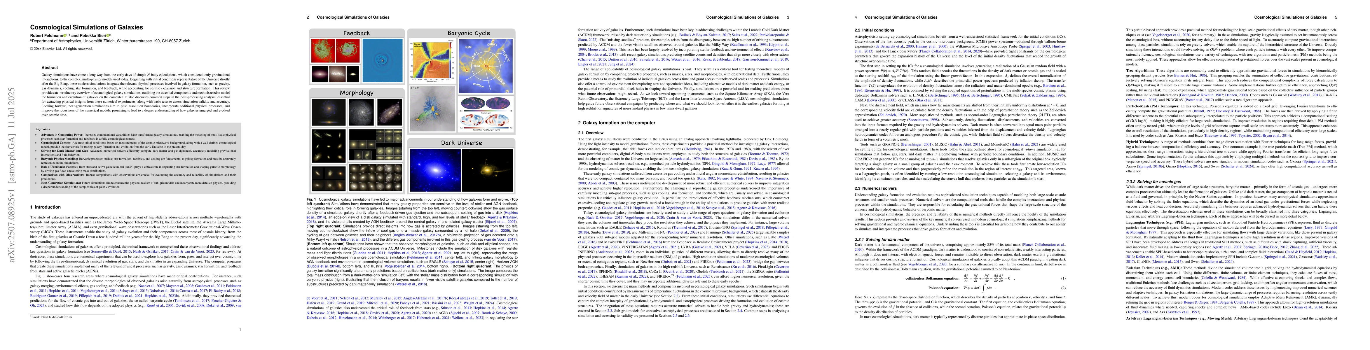 Cosmological galaxy simulations have evolved from basic N-body calculations to sophisticated models integrating gravity, gas dynamics, cooling, star formation, and feedback. These simulations, starting from early universe conditions, aim to enhance resolution, include more physical processes, and improve numerical models for a deeper understanding of galaxy formation and evolution.