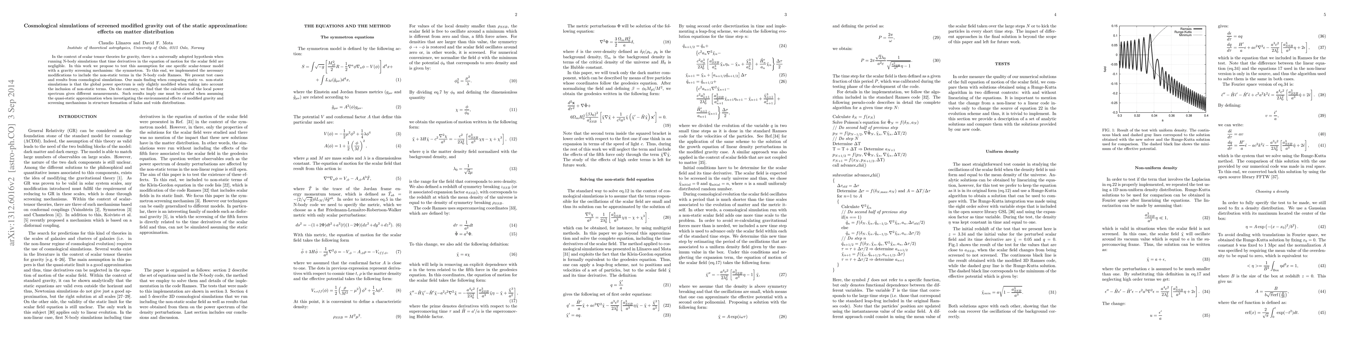 In the context of scalar tensor theories for gravity, there is a universally adopted hypothesis when running N-body simulations that time derivatives in the equation of motion for the scalar field are negligible. In this work we propose to test this assumption for one specific scalar-tensor model with a gravity screening mechanism: the symmetron. To this end, we implemented the necessary modifications to include the non-static terms in the N-body code Ramses. We present test cases and results from cosmological simulations. Our main finding when comparing static vs. non-static simulations is that the global power spectrum is only slightly modified when taking into account the inclusion of non-static terms. On the contrary, we find that the calculation of the local power spectrum gives different measurements. Such results imply one must be careful when assuming the quasi-static approximation when investigating the environmental effects of modified gravity and screening mechanisms in structure formation of halos and voids distributions.