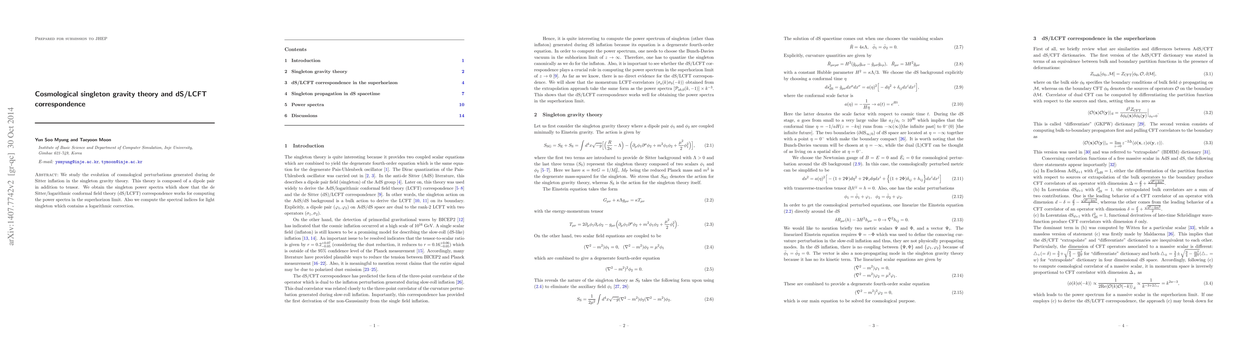 We study the evolution of cosmological perturbations generated during de Sitter inflation in the singleton gravity theory. This theory is composed of a dipole ghost pair in addition to tensor. We obtain the singleton power spectra which show that the de Sitter/logarithmic conformal field theory (dS/LCFT) correspondence works for computing the power spectra in the superhorizon limit. Also we compute the spectral indices for light singleton which contains a logarithmic correction.