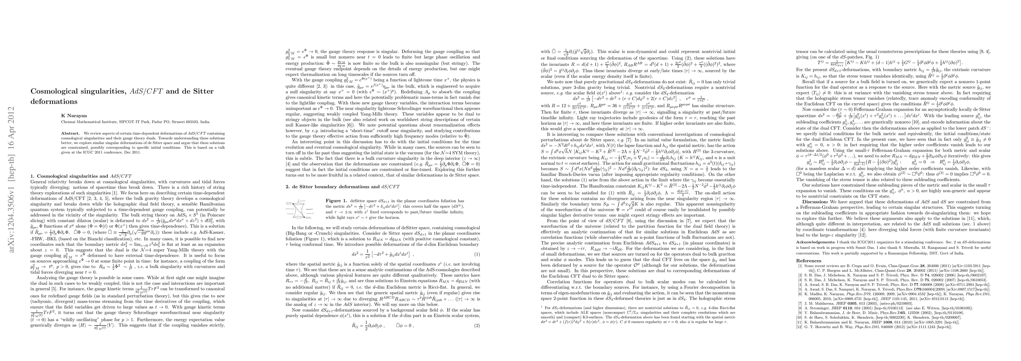This paper reviews time-dependent deformations of AdS/CFT containing cosmological singularities and their gauge theory duals, while also exploring similar singular deformations of de Sitter space, suggesting these solutions are constrained and may correspond to specific initial conditions.