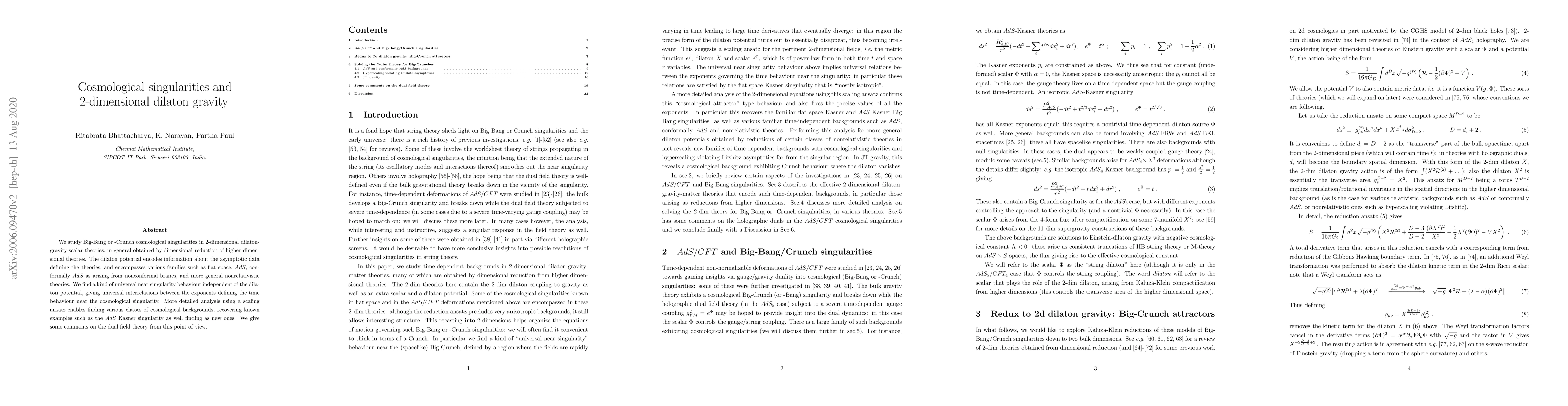 We study Big-Bang or -Crunch cosmological singularities in 2-dimensional dilaton-gravity-scalar theories, in general obtained by dimensional reduction of higher dimensional theories. The dilaton potential encodes information about the asymptotic data defining the theories, and encompasses various families such as flat space, $AdS$, conformally $AdS$ as arising from nonconformal branes, and more general nonrelativistic theories. We find a kind of universal near singularity behaviour independent of the dilaton potential, giving universal interrelations between the exponents defining the time behaviour near the cosmological singularity. More detailed analysis using a scaling ansatz enables finding various classes of cosmological backgrounds, recovering known examples such as the $AdS$ Kasner singularity as well finding as new ones. We give some comments on the dual field theory from this point of view.