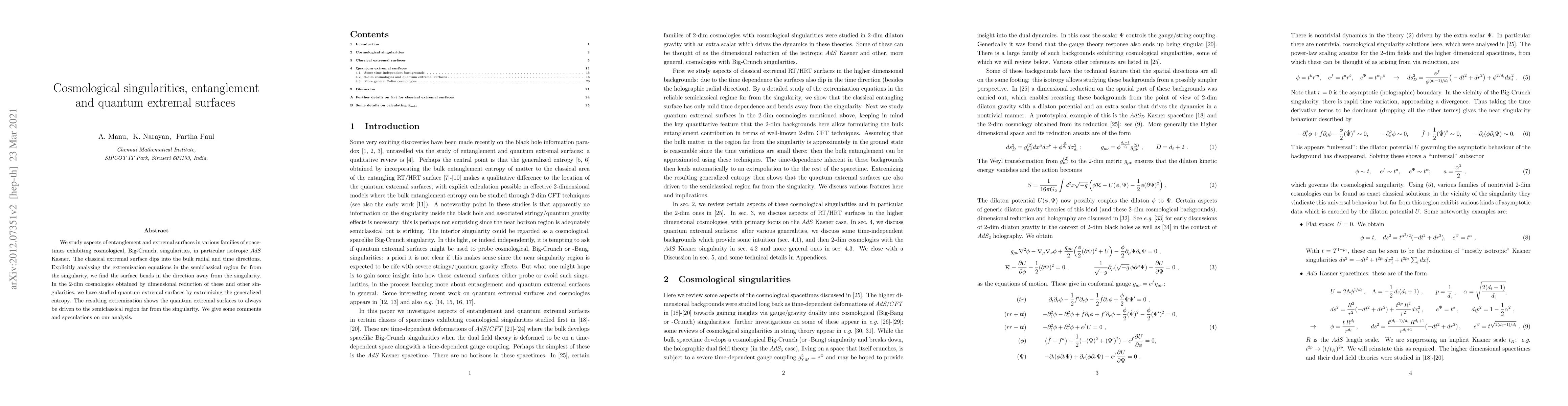 We study aspects of entanglement and extremal surfaces in various families of spacetimes exhibiting cosmological, Big-Crunch, singularities, in particular isotropic $AdS$ Kasner. The classical extremal surface dips into the bulk radial and time directions. Explicitly analysing the extremization equations in the semiclassical region far from the singularity, we find the surface bends in the direction away from the singularity. In the 2-dim cosmologies obtained by dimensional reduction of these and other singularities, we have studied quantum extremal surfaces by extremizing the generalized entropy. The resulting extremization shows the quantum extremal surfaces to always be driven to the semiclassical region far from the singularity. We give some comments and speculations on our analysis.