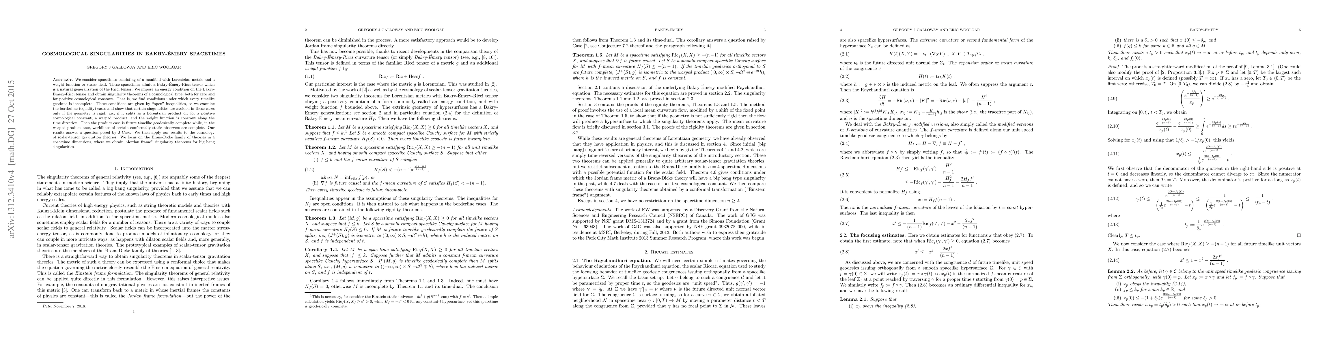 We consider spacetimes consisting of a manifold with Lorentzian metric and a weight function or scalar field. These spacetimes admit a Bakry-\'Emery-Ricci tensor which is a natural generalization of the Ricci tensor. We impose an energy condition on the Bakry-\'Emery-Ricci tensor and obtain singularity theorems of a cosmological type, both for zero and for positive cosmological constant. That is, we find conditions under which every timelike geodesic is incomplete. These conditions are given by "open" inequalities, so we examine the borderline (equality) cases and show that certain singularities are avoided in these cases only if the geometry is rigid; i.e., if it splits as a Lorentzian product or, for a positive cosmological constant, a warped product, and the weight function is constant along the time direction. Then the product case is future timelike geodesically complete while, in the warped product case, worldlines of certain conformally static observers are complete. Our results answer a question posed by J Case. We then apply our results to the cosmology of scalar-tensor gravitation theories. We focus on the Brans-Dicke family of theories in 4 spacetime dimensions, where we obtain "Jordan frame" singularity theorems for big bang singularities.