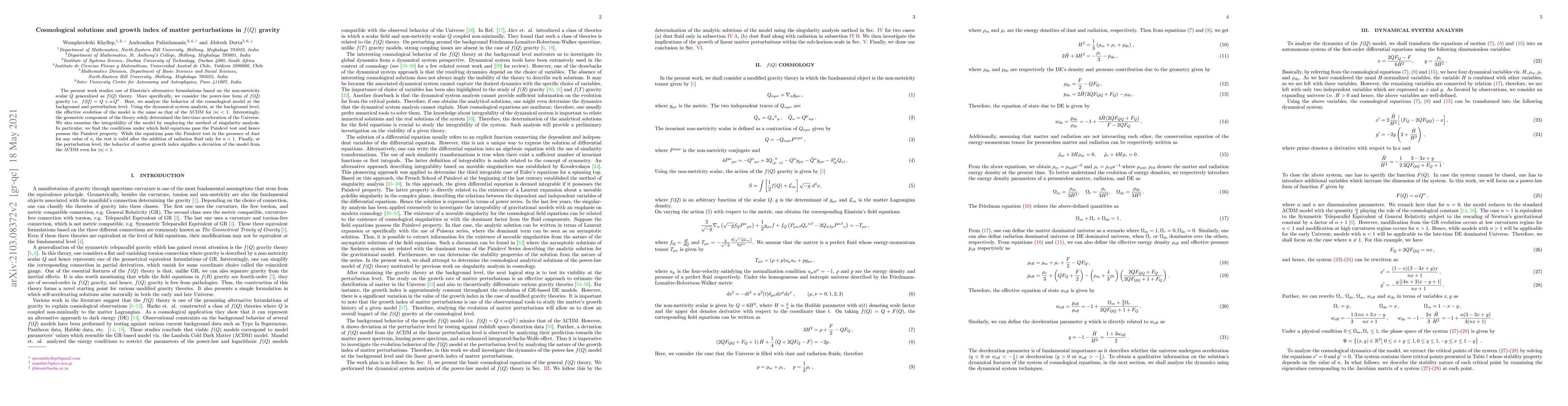 The present work studies one of Einstein's alternative formulations based on the non-metricity scalar $Q$ generalized as $f(Q)$ theory. More specifically, we consider the power-law form of $f(Q)$ gravity i.e. $f(Q)=Q+\alpha\, Q^n$. Here, we analyze the behavior of the cosmological model at the background and perturbation level. At the background level, we find the effective evolution of the model is the same as that of the $\Lambda$CDM for $|n|<1$. Interestingly, the geometric component of the theory solely determined the late-time acceleration of the Universe. We also examine the integrability of the model by employing the method of singularity analysis. In particular, we find the conditions under which field equations pass the Painlev\'{e} test and hence possess the Painlev\'{e} property. While the equations pass the Painlev\'{e} test in the presence of dust for any value of $n$, the test is valid after the addition of radiation fluid only for $n<1$. Finally, at the perturbation level, the behavior of matter growth index signifies a deviation of the model from the $\Lambda$CDM even for $|n|<1$.