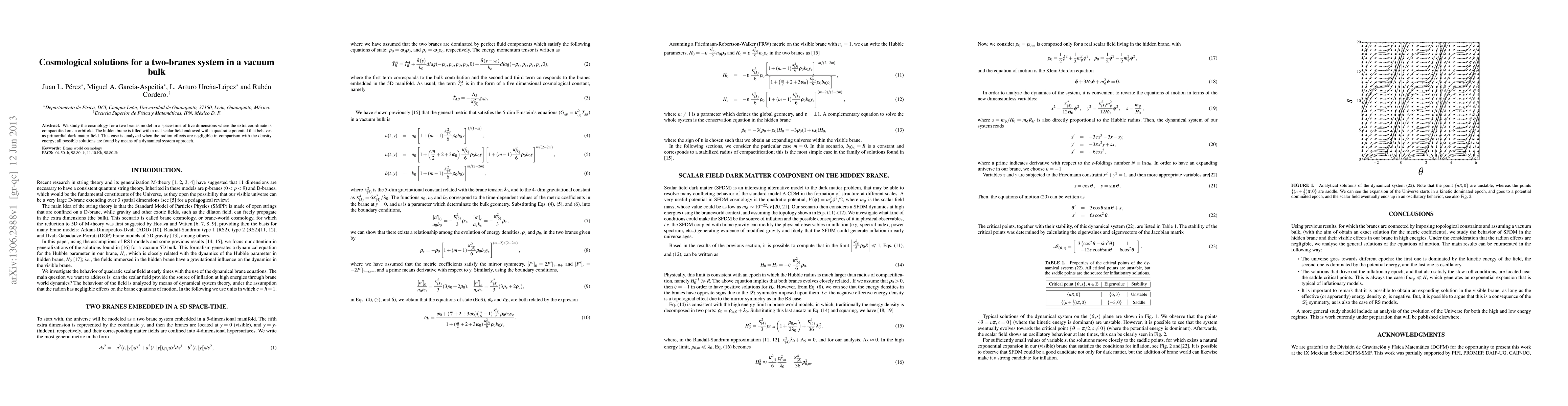 We study the cosmology for a two branes model in a space-time of five dimensions where the extra coordinate is compactified on an orbifold. The hidden brane is filled with a real scalar field endowed with a quadratic potential that behaves as primordial dark matter field. This case is analyzed when the radion effects are negligible in comparison with the density energy; all possible solutions are found by means of a dynamical system approach.