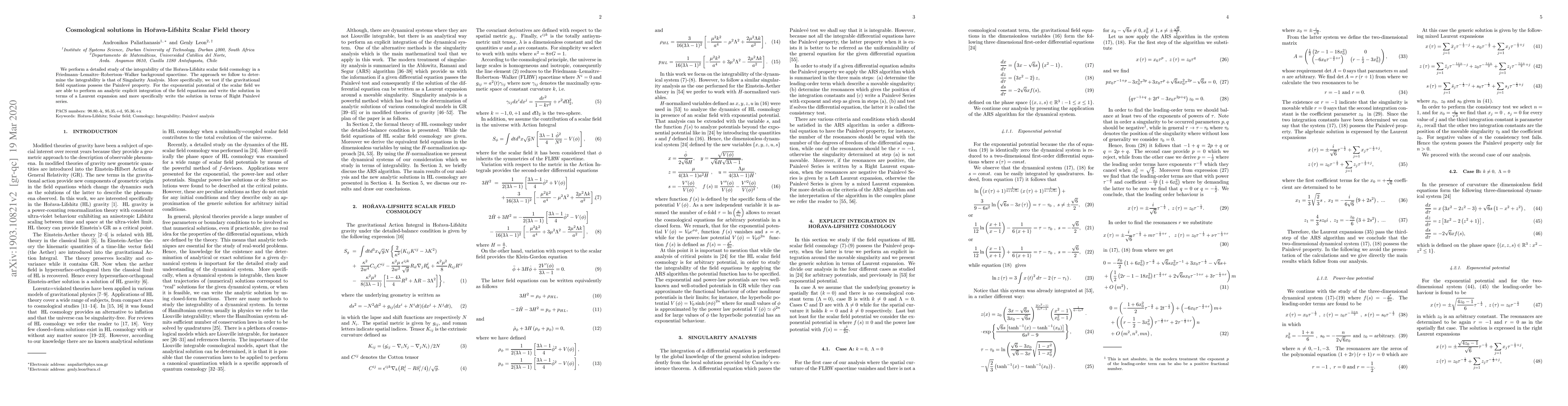 We perform a detailed study on the integrability of the Ho\v{r}% ava-Lifshitz scalar field cosmology in a Friedmann--Lema\^{\i}% tre--Robertson--Walker background spacetime. The approach we follow to determine the integrability is that of the Singularity Analysis. More specifically, we test if the gravitational field equations possesses the Painlev\'{e} property. For the exponential potential of the scalar field we are able to perform an analytic explicit integration of the field equations and write the solution in terms of Laurent expansion and more specifically write the solution in terms of Right Painlev\'{e} series.