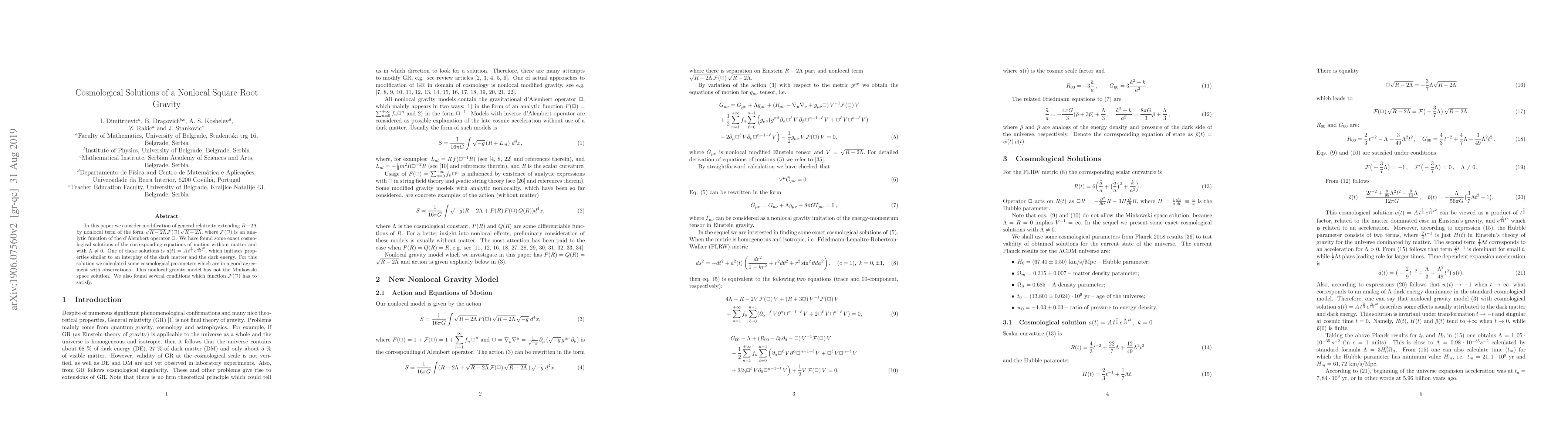 Researchers found exact cosmological solutions for a modified gravity model with nonlocal square root gravity, including one that mimics dark matter and dark energy properties, and agree with some observations.