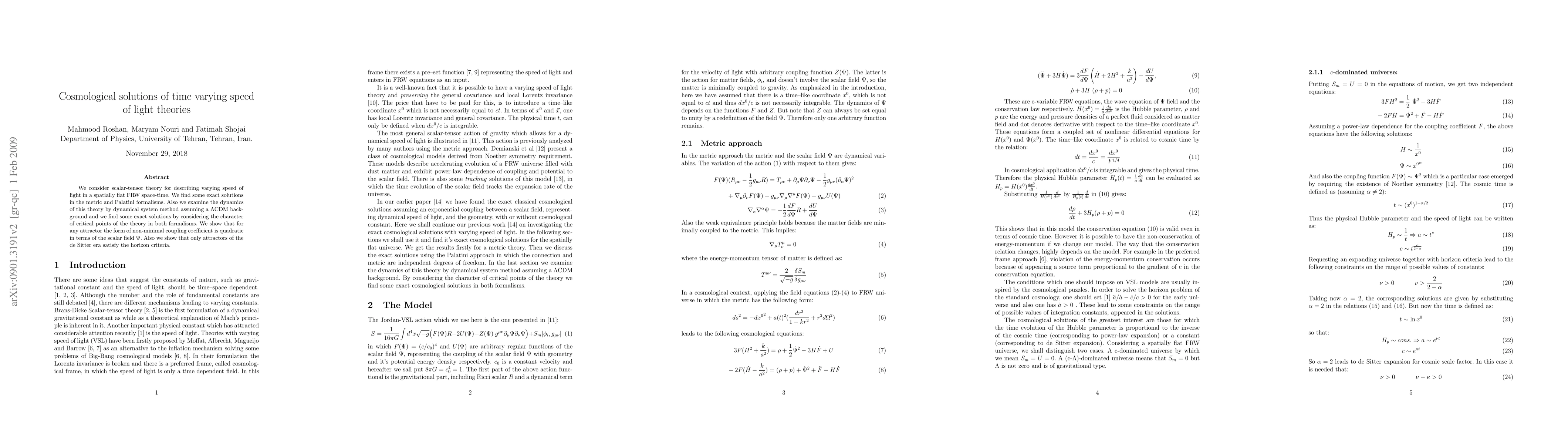 We consider scalar-tensor theory for describing varying speed of light in a spatially flat FRW space-time. We find some exact solutions in the metric and Palatini formalisms. Also we examine the dynamics of this theory by dynamical system method assuming a $\Lambda$CDM background and we find some exact solutions by considering the character of critical points of the theory in both formalisms. We show that for any attractor the form of non-minimal coupling coefficient is quadratic in terms of the scalar field $\Psi$. Also we show that only attractors of the de Sitter era satisfy the horizon criteria.