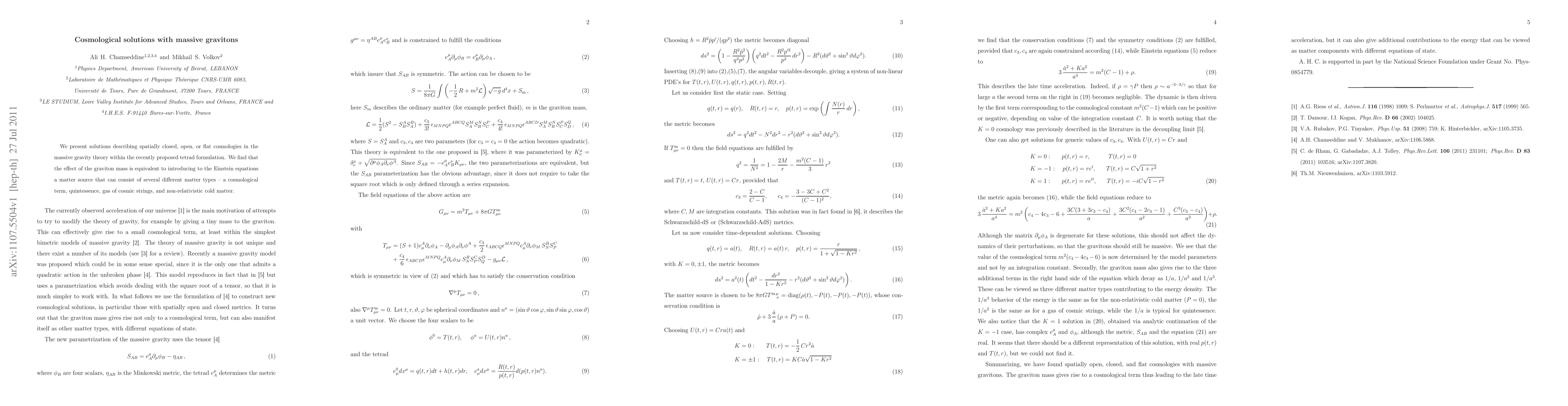 The paper presents solutions for closed, open, or flat cosmologies in massive gravity theory, showing that graviton mass is equivalent to a matter source that can include various types of matter.