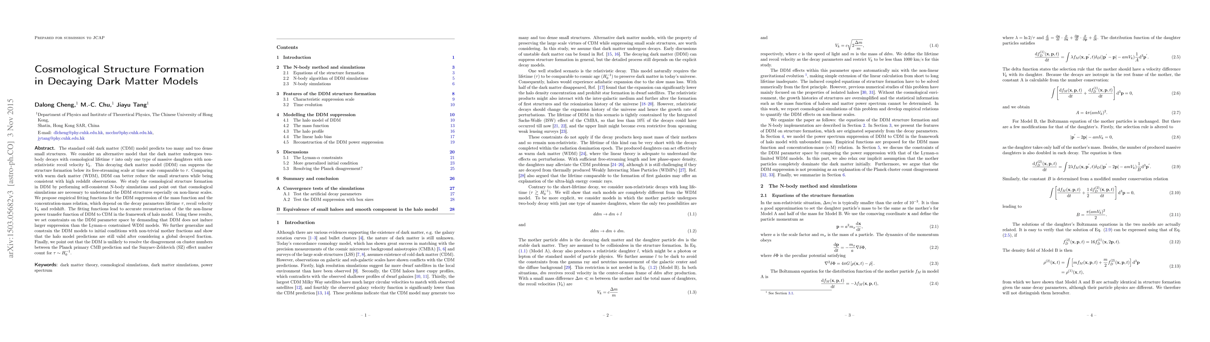 This paper explores an alternative cosmological model where dark matter decays, proposing that this decaying dark matter (DDM) can suppress the formation of small structures better than warm dark matter (WDM) while remaining consistent with observational data. The study uses N-body simulations to analyze structure formation and provides empirical fitting functions for DDM's effects, concluding that DDM is unlikely to resolve the discrepancy between CMB and SZ effect cluster counts.