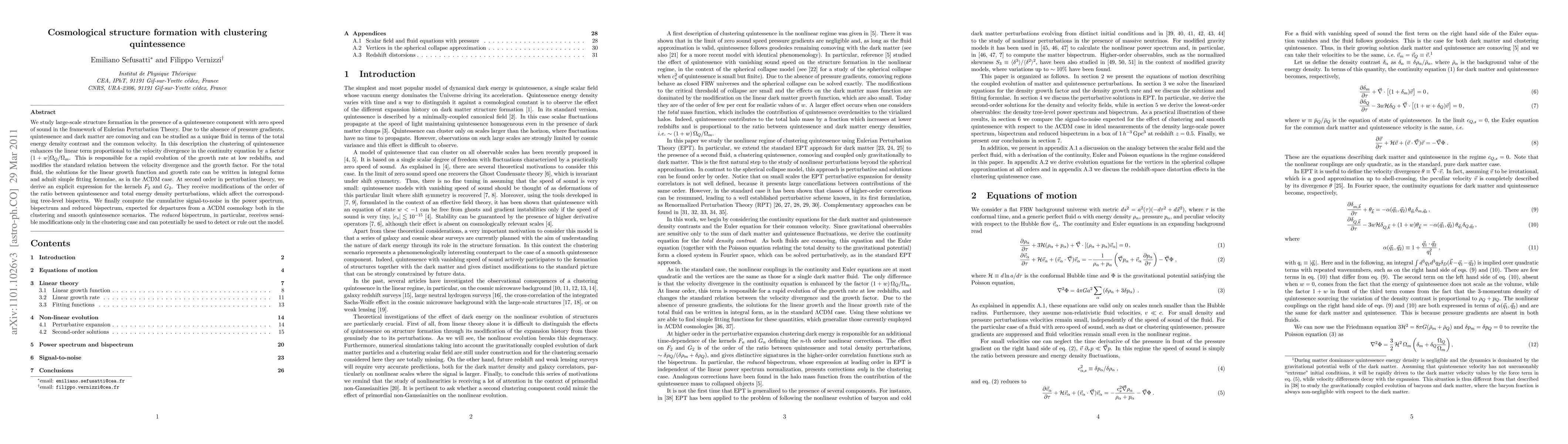We study large-scale structure formation in the presence of a quintessence component with zero speed of sound in the framework of Eulerian Perturbation Theory. Due to the absence of pressure gradients, quintessence and dark matter are comoving and can be studied as a unique fluid in terms of the total energy density contrast and the common velocity. In this description the clustering of quintessence enhances the linear term proportional to the velocity divergence in the continuity equation by a factor (1+w) Omega_Q / Omega_m. This is responsible for a rapid evolution of the growth rate at low redshifts, and modifies the standard relation between the velocity divergence and the growth factor. For the total fluid, the solutions for the linear growth function and growth rate can be written in integral forms and admit simple fitting formulae, as in the LambdaCDM case. At second order in perturbation theory, we derive an explicit expression for the kernels F_2 and G_2. They receive modifications of the order of the ratio between quintessence and total energy density perturbations, which affect the corresponding tree-level bispectra. We finally compute the cumulative signal-to-noise in the power spectrum, bispectrum and reduced bispectrum, expected for departures from a LambdaCDM cosmology both in the clustering and smooth quintessence scenarios. The reduced bispectrum, in particular, receives sensible modifications only in the clustering case and can potentially be used to detect or rule out the model.