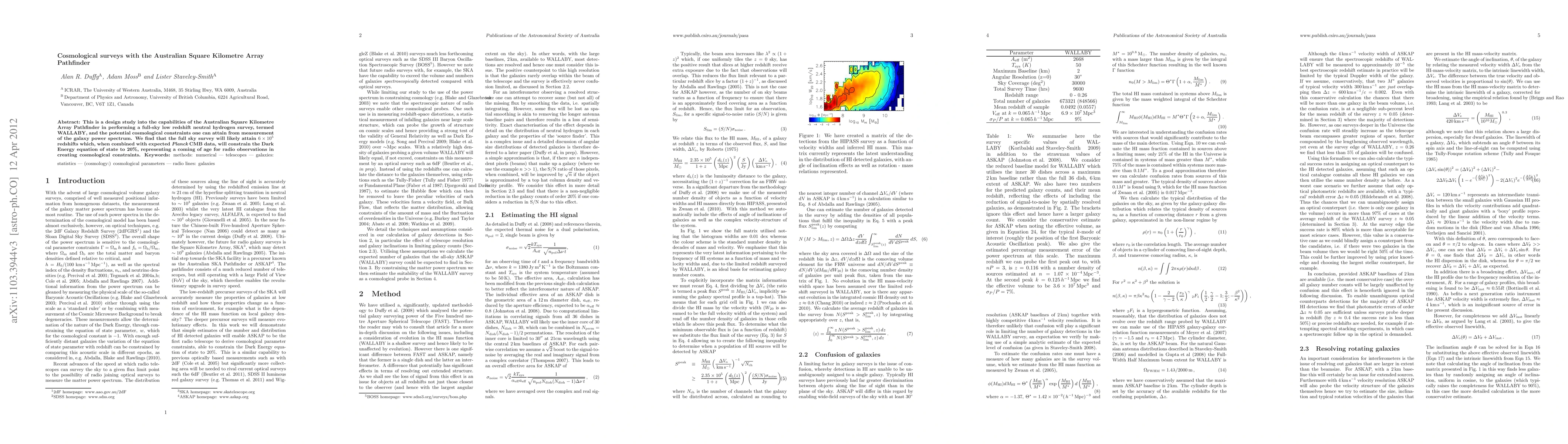 This study explores the Australian Square Kilometre Array Pathfinder's ability to conduct a full-sky neutral hydrogen survey, WALLABY, and its potential to constrain the Dark Energy equation of state to 20% when combined with Planck CMB data. The survey is expected to achieve 0.6 million redshifts, marking significant progress in radio astronomy's cosmological contributions.