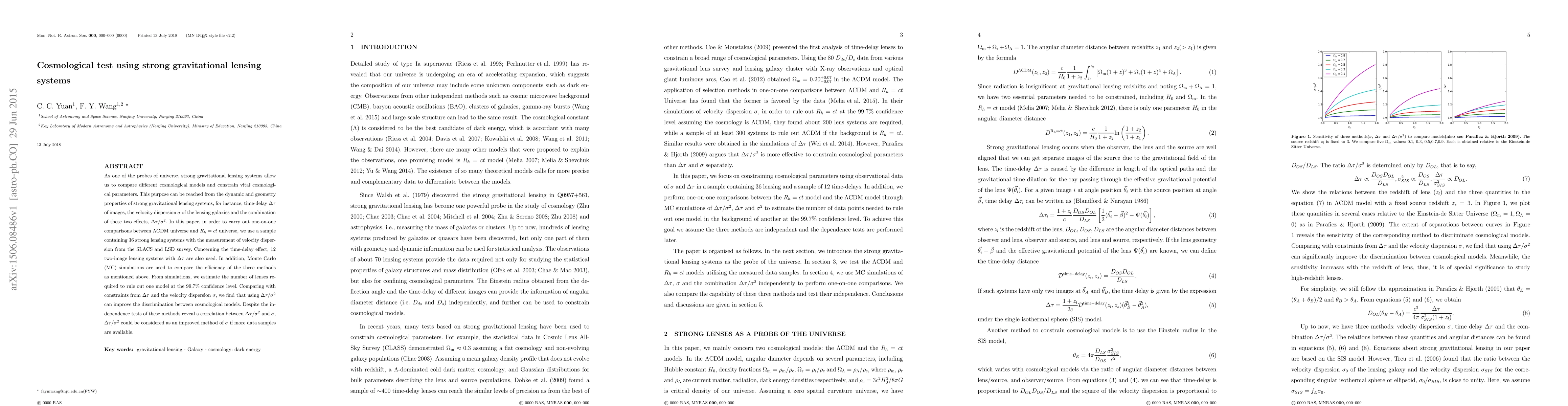 This paper investigates the use of strong gravitational lensing systems to compare $\Lambda$CDM and $R_h=ct$ cosmological models, finding that $\Delta\tau/\sigma^2$ improves discrimination over $\sigma$ alone, though it remains correlated with $\sigma$. The study uses 36 lensing systems and Monte Carlo simulations to estimate the number of lenses needed to rule out one model at high confidence.
