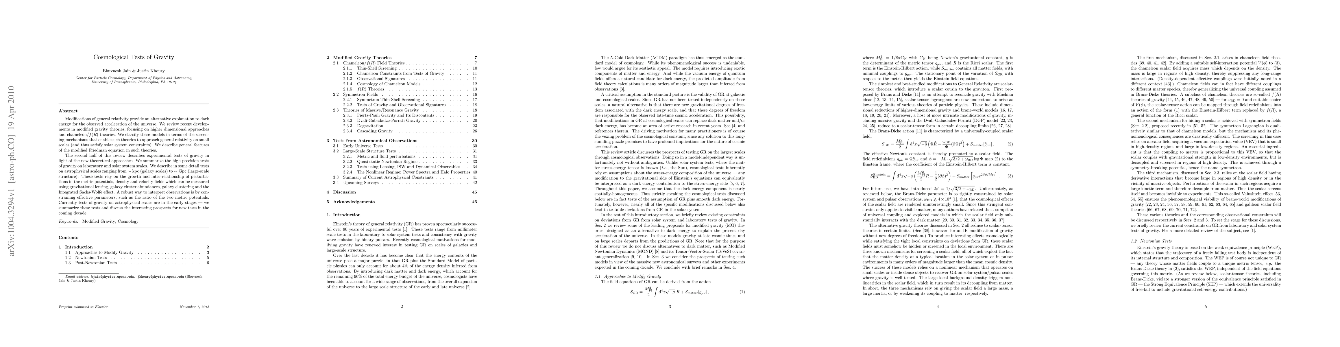 Modifications of general relativity provide an alternative explanation to dark energy for the observed acceleration of the universe. We review recent developments in modified gravity theories, focusing on higher dimensional approaches and chameleon/f(R) theories. We classify these models in terms of the screening mechanisms that enable such theories to approach general relativity on small scales (and thus satisfy solar system constraints). We describe general features of the modified Friedman equation in such theories. The second half of this review describes experimental tests of gravity in light of the new theoretical approaches. We summarize the high precision tests of gravity on laboratory and solar system scales. We describe in some detail tests on astrophysical scales ranging from ~kpc (galaxy scales) to ~Gpc (large-scale structure). These tests rely on the growth and inter-relationship of perturbations in the metric potentials, density and velocity fields which can be measured using gravitational lensing, galaxy cluster abundances, galaxy clustering and the Integrated Sachs-Wolfe effect. A robust way to interpret observations is by constraining effective parameters, such as the ratio of the two metric potentials. Currently tests of gravity on astrophysical scales are in the early stages --- we summarize these tests and discuss the interesting prospects for new tests in the coming decade.