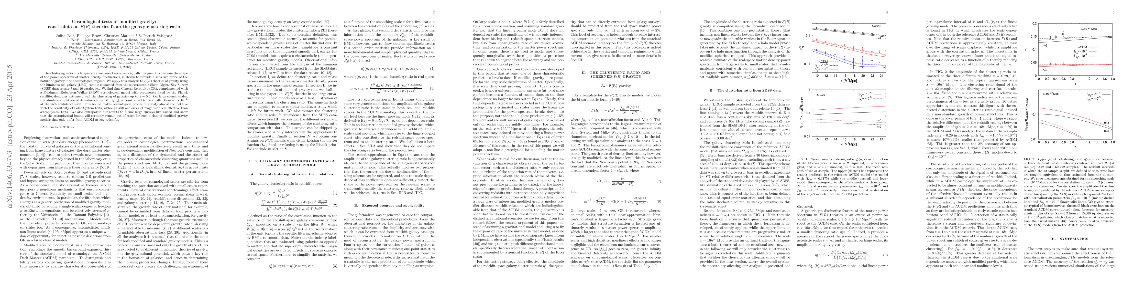 The clustering ratio $\eta$, a large-scale structure observable originally designed to constrain the shape of the power spectrum of matter density fluctuations, is shown to provide a sensitive probe of the nature of gravity in the cosmological regime. We apply this analysis to $F(R)$ theories of gravity using the luminous red galaxy (LRG) sample extracted from the spectroscopic Sloan Digital Sky Survey (SDSS) data release 7 and 10 catalogues. We find that General Relativity (GR), complemented with a Friedmann-Robertson-Walker (FRW) cosmological model with parameters fixed by the Planck satellite, describes extremely well the clustering of galaxies up to $z\sim 0.6$. On large cosmic scales, the absolute amplitude of deviations from GR, $|f_{R_0 }|$, is constrained to be smaller than $4.6 \times 10^{-5}$ at the $95\%$ confidence level. This bound makes cosmological probes of gravity almost competitive with the sensitivity of Solar System tests, although still one order of magnitude less effective than astrophysical tests. We also extrapolate our results to future large surveys like Euclid and show that the astrophysical bound will certainly remain out of reach for such a class of modified-gravity models that only differ from $\Lambda$CDM at low redshifts.
