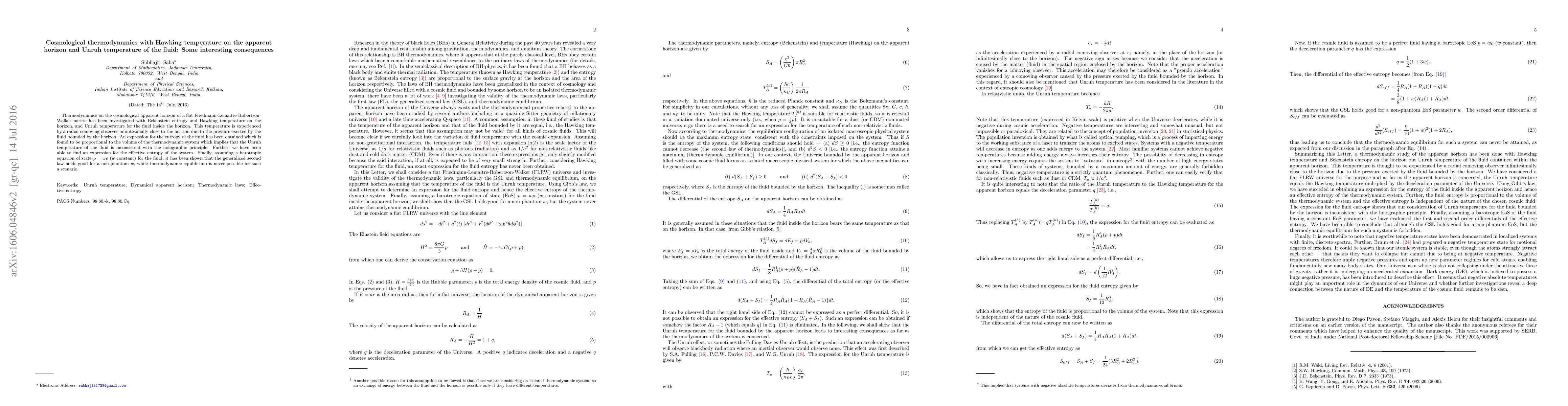 Research explores thermodynamics on a cosmological horizon, revealing that Unruh temperature is inconsistent with holographic principle and general second law holds for certain fluid equations of state.