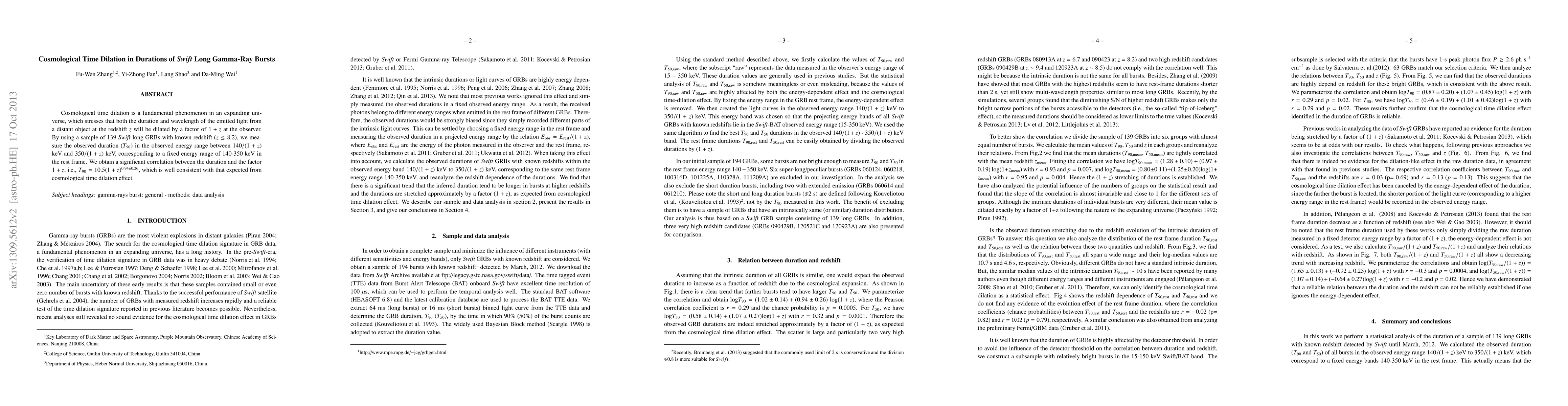 This study investigates the cosmological time dilation effect on the durations of 139 long gamma-ray bursts (GRBs) observed by the Swift satellite, finding a significant correlation between burst duration and redshift factor $1+z$. The results support the expected relationship $T_{90}=10.5(1+z)^{0.94\pm0.26}$.