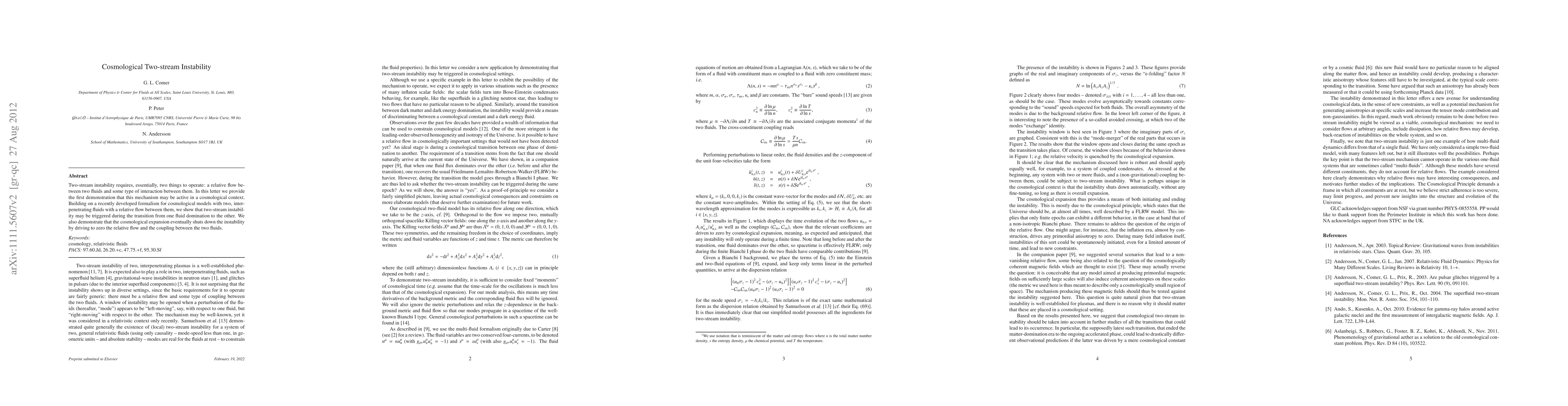 This paper demonstrates the operation of two-stream instability in a cosmological context, showing it can be triggered during transitions between fluid domination and is eventually suppressed by cosmological expansion. The study builds on a new formalism for cosmological models with interpenetrating fluids.