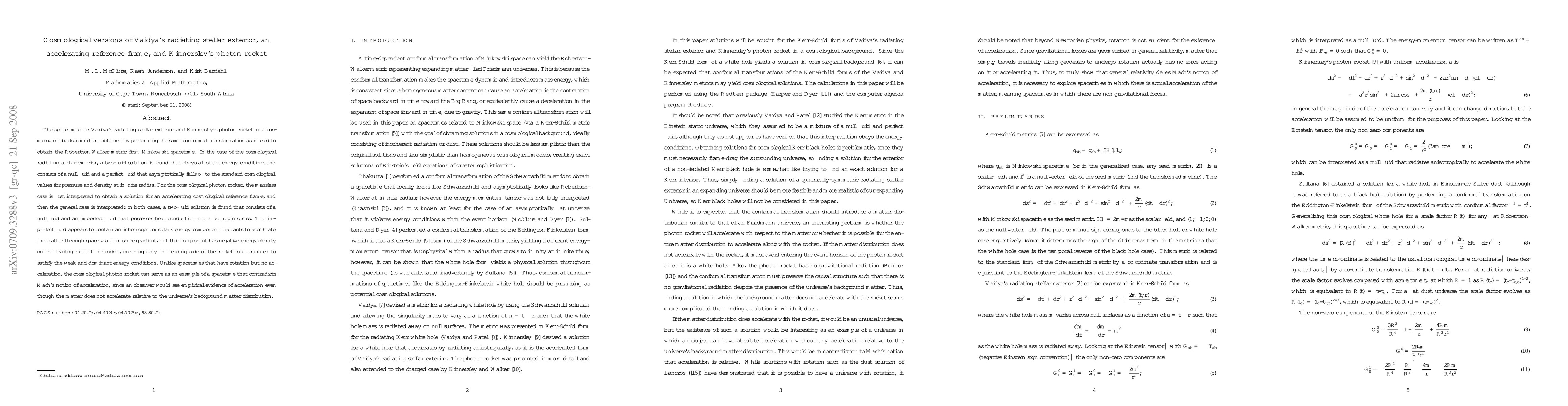 The spacetimes for Vaidya's radiating stellar exterior and Kinnersley's photon rocket in a cosmological background are obtained by performing the same conformal transformation as is used to obtain the Robertson-Walker metric from Minkowski spacetime. In the case of the cosmological radiating stellar exterior, a two-fluid solution is found that obeys all of the energy conditions and consists of a null fluid and a perfect fluid that asymptotically falls off to the standard cosmological values for pressure and density at infinite radius. For the cosmological photon rocket, the massless case is first interpreted to obtain a solution for an accelerating cosmological reference frame, and then the general case is interpreted: in both cases, a two-fluid solution is found that consists of a null fluid and an imperfect fluid that possesses heat conduction and anisotropic stress. The imperfect fluid appears to contain an inhomogeneous dark energy component that acts to accelerate the matter through space via a pressure gradient, but this component has negative energy density on the trailing side of the rocket, meaning only the leading side of the rocket is guaranteed to satisfy the weak and dominant energy conditions. Unlike spacetimes that have rotation but no acceleration, the cosmological photon rocket can serve as an example of a spacetime that contradicts Mach's notion of acceleration, since an observer would see empirical evidence of acceleration even though the matter does not accelerate relative to the universe's background matter distribution.