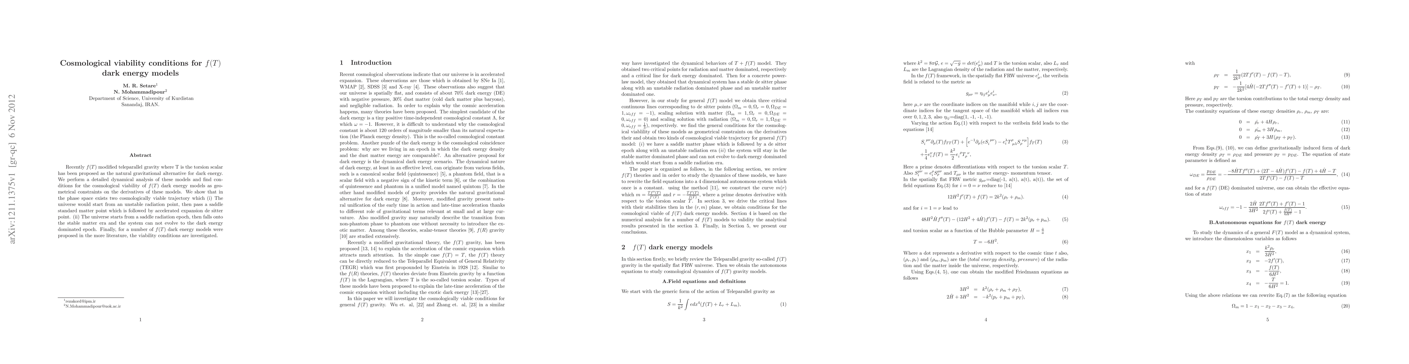Research on $f(T)$ dark energy models reveals two viable cosmological trajectories: one starting from radiation, passing through matter, and accelerating expansion, and another from radiation to stable matter with no evolution to dark energy dominance.