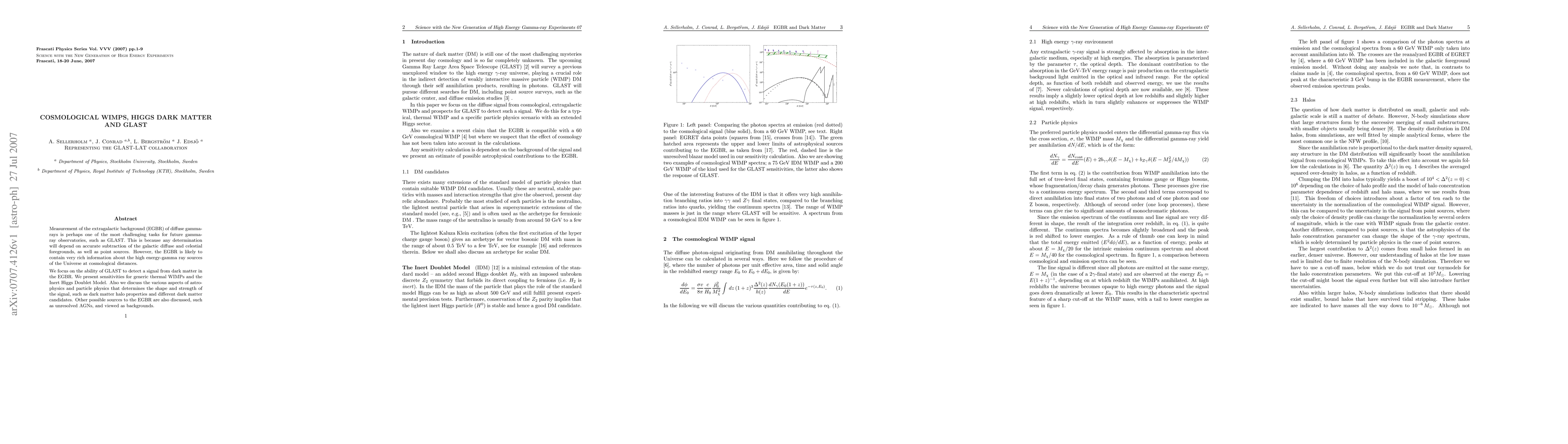 Measurement of the extragalactic background (EGBR) of diffuse gamma-rays is perhaps one of the most challenging tasks for future gamma-ray observatories, such as GLAST. This is because any determination will depend on accurate subtraction of the galactic diffuse and celestial foregrounds, as well as point sources. However, the EGBR is likely to contain very rich information about the high energy-gamma ray sources of the Universe at cosmological distances. We focus on the ability of GLAST to detect a signal from dark matter in the EGBR. We present sensitivities for generic thermal WIMPs and the Inert Higgs Doublet Model. Also we discuss the various aspects of astrophysics and particle physics that determines the shape and strength of the signal, such as dark matter halo properties and different dark matter candidates. Other possible sources to the EGBR are also discussed, such as unresolved AGNs, and viewed as backgrounds.