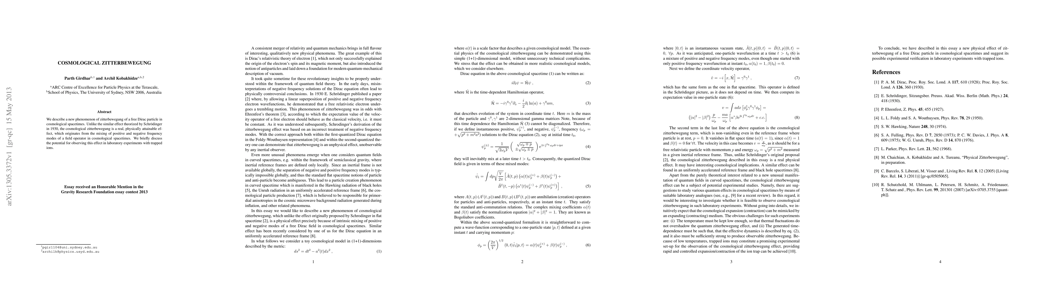 This paper introduces the concept of cosmological zitterbewegung in free Dirac particles, a real, observable effect caused by the interaction of positive and negative frequency modes in cosmological spacetimes, distinct from Schrödinger's theoretical 1930 version. The paper also suggests potential laboratory observation possibilities using trapped ions.