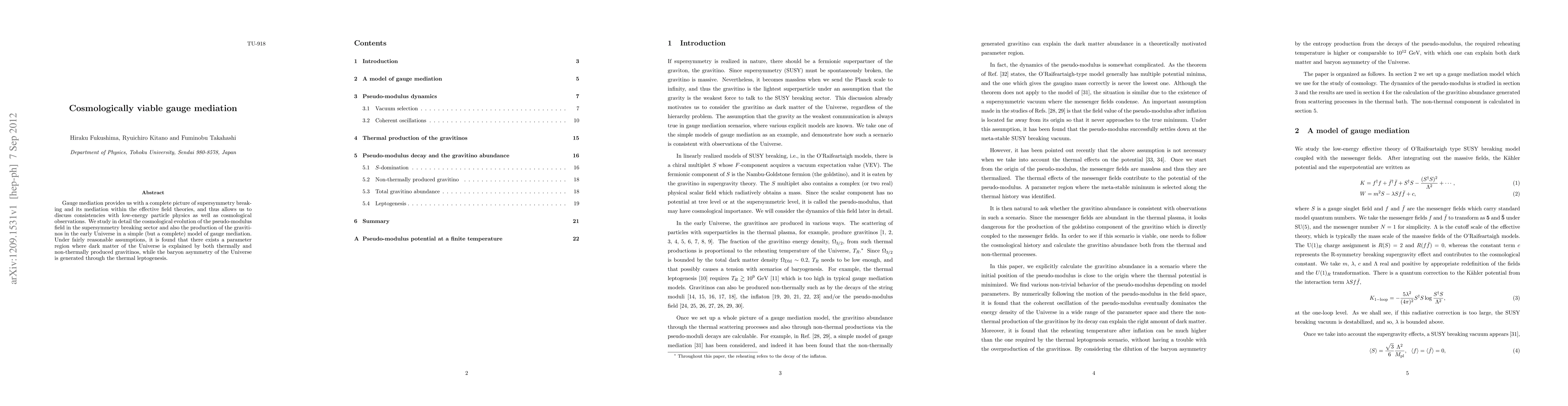 Gauge mediation provides us with a complete picture of supersymmetry breaking and its mediation within the effective field theories, and thus allows us to discuss consistencies with low-energy particle physics as well as cosmological observations. We study in detail the cosmological evolution of the pseudo-modulus field in the supersymmetry breaking sector and also the production of the gravitinos in the early Universe in a simple (but a complete) model of gauge mediation. Under fairly reasonable assumptions, it is found that there exists a parameter region where dark matter of the Universe is explained by both thermally and non-thermally produced gravitinos, while the baryon asymmetry of the Universe is generated through the thermal leptogenesis.