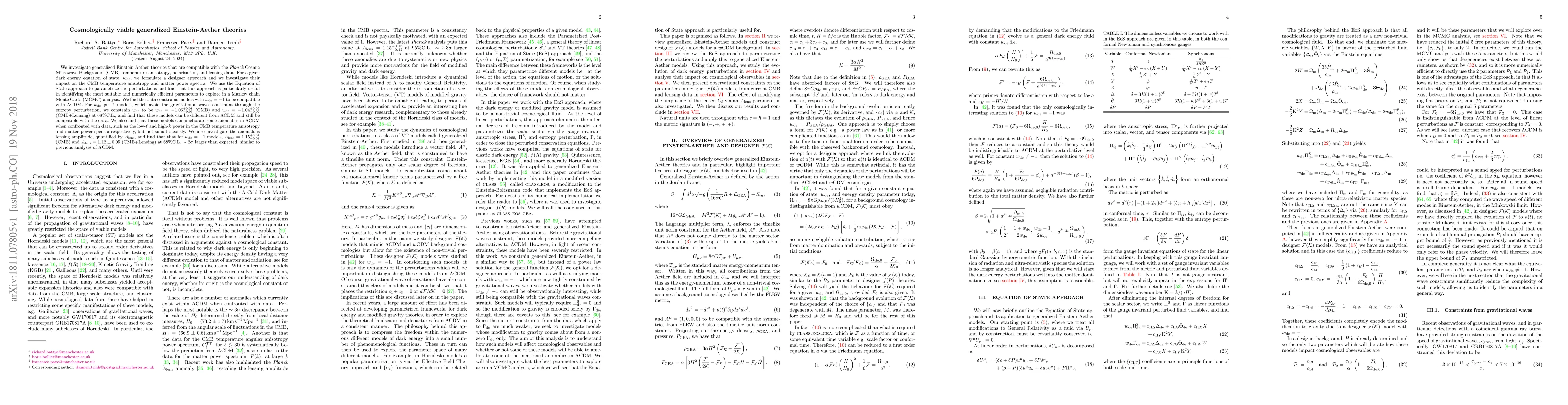 The paper presents a designer approach for generalized Einstein-Aether theories, using an EoS approach to parametrize perturbations and conducting MCMC analysis to constrain models compatible with cosmological data.