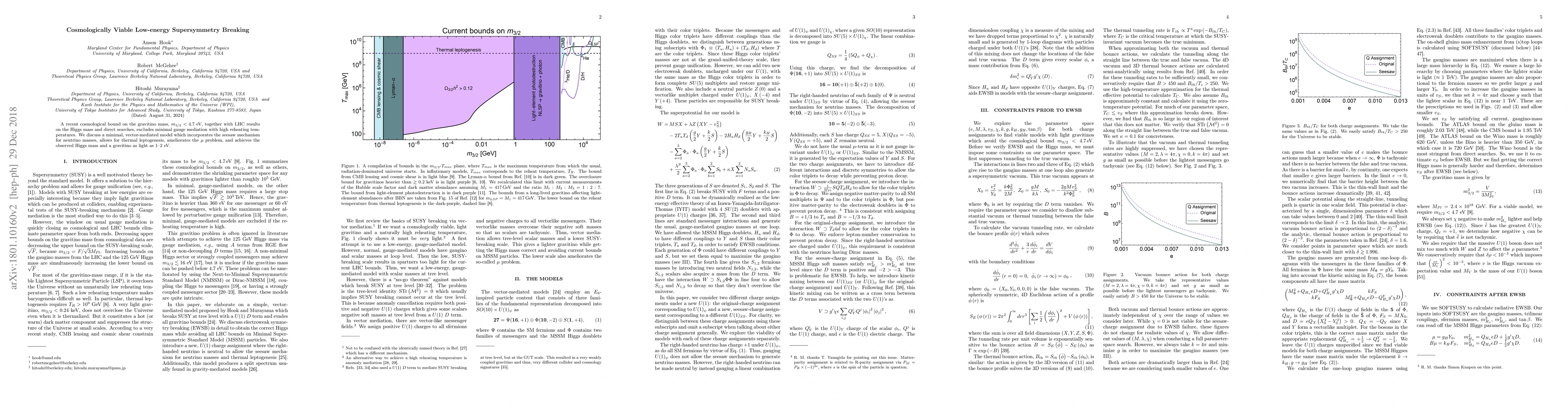 A recent cosmological bound on the gravitino mass, $m_{3/2}<4.7$ eV, together with LHC results on the Higgs mass and direct searches, excludes minimal gauge mediation with high reheating temperatures. We discuss a minimal, vector-mediated model which incorporates the seesaw mechanism for neutrino masses, allows for thermal leptogenesis, ameliorates the $\mu$ problem, and achieves the observed Higgs mass and a gravitino as light as $1$-$2$ eV.