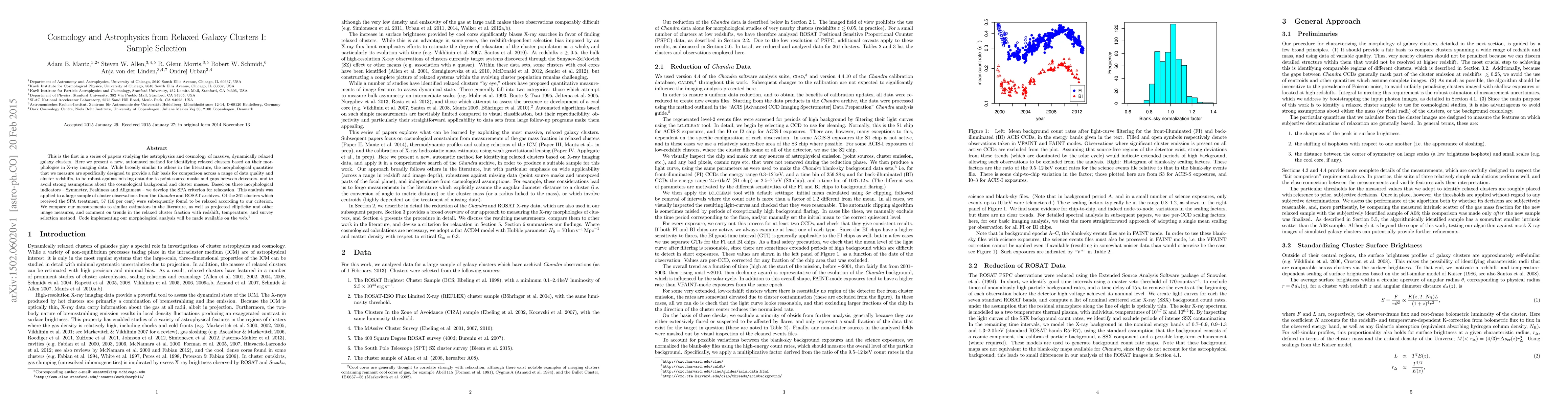 This is the first in a series of papers studying the astrophysics and cosmology of massive, dynamically relaxed galaxy clusters. Here we present a new, automated method for identifying relaxed clusters based on their morphologies in X-ray imaging data. While broadly similar to others in the literature, the morphological quantities that we measure are specifically designed to provide a fair basis for comparison across a range of data quality and cluster redshifts, to be robust against missing data due to point-source masks and gaps between detectors, and to avoid strong assumptions about the cosmological background and cluster masses. Based on three morphological indicators - Symmetry, Peakiness and Alignment - we develop the SPA criterion for relaxation. This analysis was applied to a large sample of cluster observations from the Chandra and ROSAT archives. Of the 361 clusters which received the SPA treatment, 57 (16 per cent) were subsequently found to be relaxed according to our criterion. We compare our measurements to similar estimators in the literature, as well as projected ellipticity and other image measures, and comment on trends in the relaxed cluster fraction with redshift, temperature, and survey selection method. Code implementing our morphological analysis will be made available on the web.