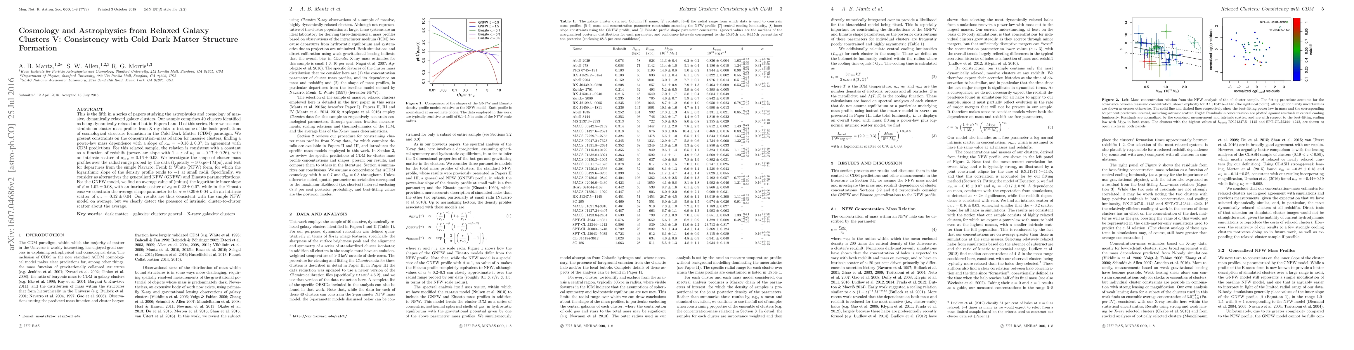 This paper examines the consistency of relaxed galaxy clusters with the Cold Dark Matter (CDM) model, finding a power-law mass dependence in the concentration-mass relation that aligns with CDM predictions. The study also confirms the average shape of cluster mass profiles aligns with the Navarro, Frenk & White (NFW) model, though it detects significant intrinsic scatter among clusters.
