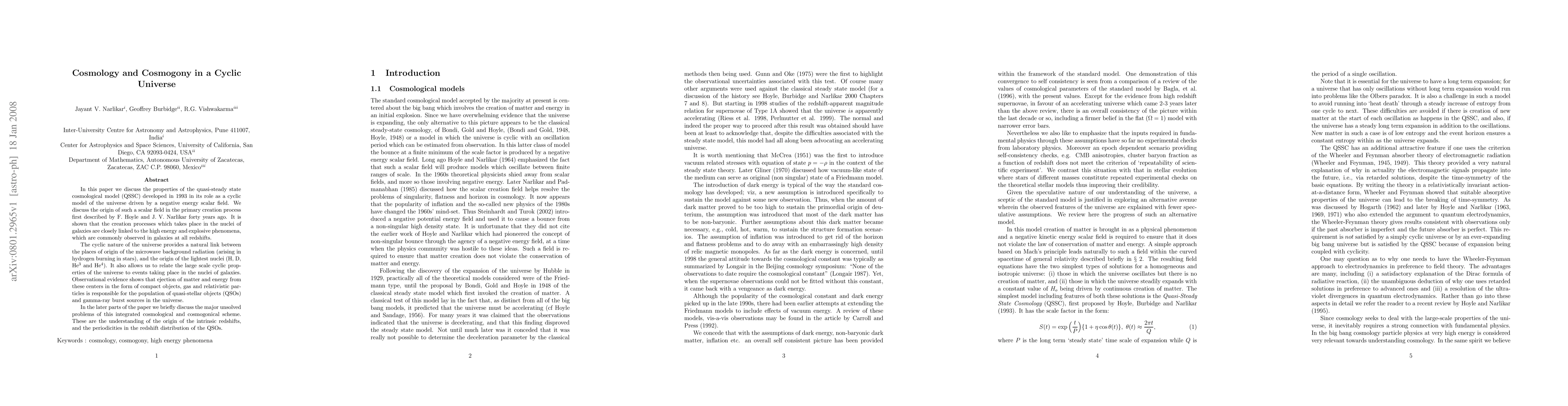 In this paper we discuss the properties of the quasi-steady state cosmological model (QSSC) developed in 1993 in its role as a cyclic model of the universe driven by a negative energy scalar field. We discuss the origin of such a scalar field in the primary creation process first described by F. Hoyle and J. V. Narlikar forty years ago. It is shown that the creation processes which takes place in the nuclei of galaxies are closely linked to the high energy and explosive phenomena, which are commonly observed in galaxies at all redshifts. The cyclic nature of the universe provides a natural link between the places of origin of the microwave background radiation (arising in hydrogen burning in stars), and the origin of the lightest nuclei (H, D, He$^3$ and He$^4$). It also allows us to relate the large scale cyclic properties of the universe to events taking place in the nuclei of galaxies. Observational evidence shows that ejection of matter and energy from these centers in the form of compact objects, gas and relativistic particles is responsible for the population of quasi-stellar objects (QSOs) and gamma-ray burst sources in the universe. In the later parts of the paper we briefly discuss the major unsolved problems of this integrated cosmological and cosmogonical scheme. These are the understanding of the origin of the intrinsic redshifts, and the periodicities in the redshift distribution of the QSOs.