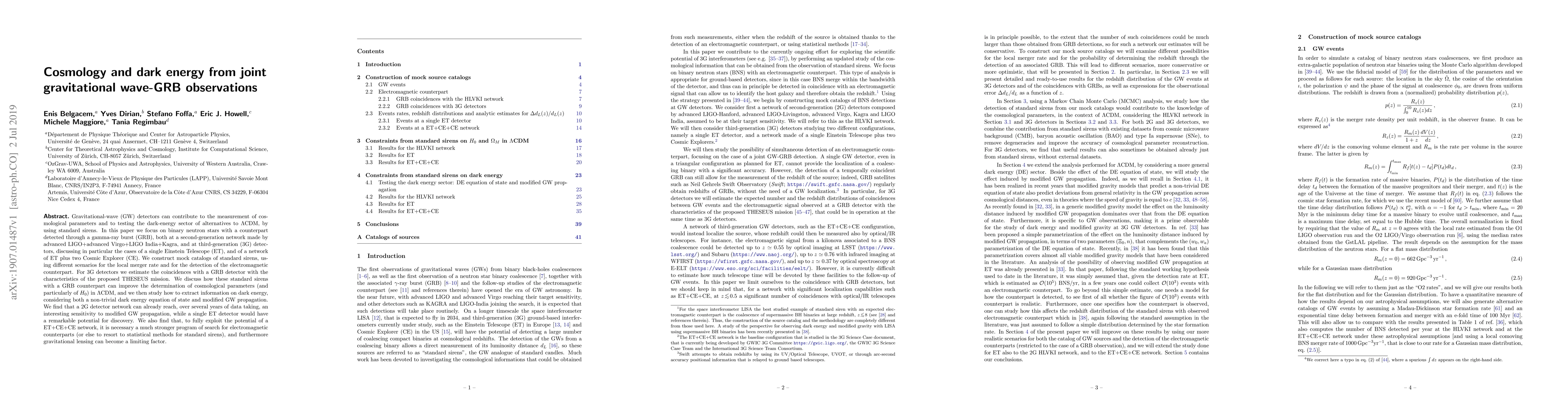 This paper explores how joint observations of gravitational waves (GWs) from binary neutron stars and gamma-ray bursts (GRBs) can enhance our understanding of cosmological parameters and dark energy. Using second and third-generation detectors, it's found that these observations can significantly improve $H_0$ measurement and test dark energy models. A single Einstein Telescope (ET) and a network of ET plus two Cosmic Explorer (CE) detectors show promising sensitivity to modified GW propagation and dark energy equation of state. However, successful exploitation of third-generation networks depends on robust electromagnetic counterpart searches and accounting for gravitational lensing effects.