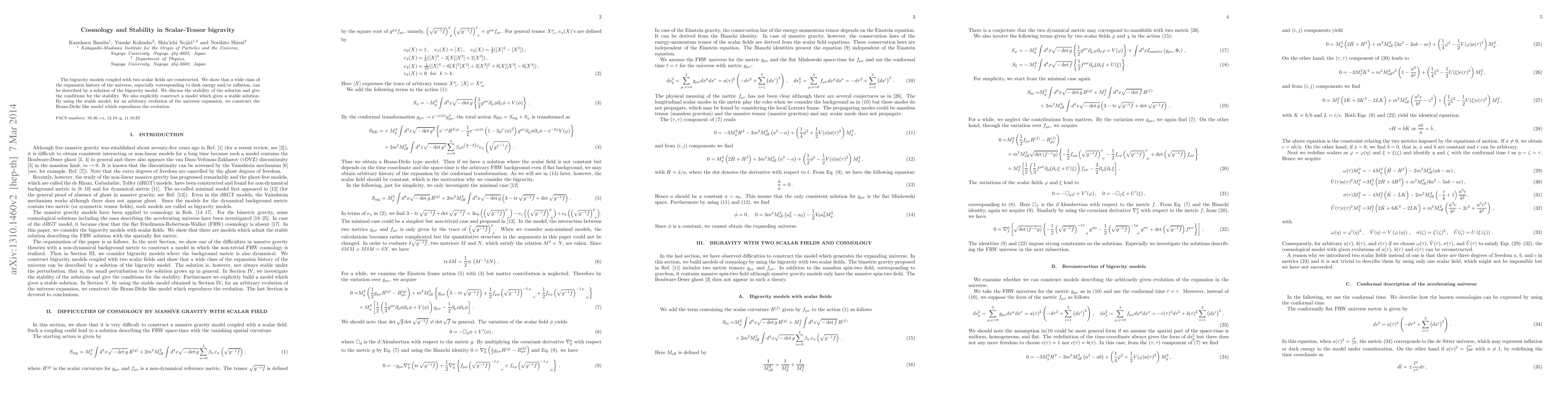 The bigravity models coupled with two scalar fields are constructed. We show that a wide class of the expansion history of the universe, especially corresponding to dark energy and/or inflation, can be described by a solution of the bigravity model. We discuss the stability of the solution and give the conditions for the stability. We also explicitly construct a model which gives a stable solution. By using the stable model, for an arbitrary evolution of the universe expansion, we construct the Brans-Dicke like model which reproduces the evolution.