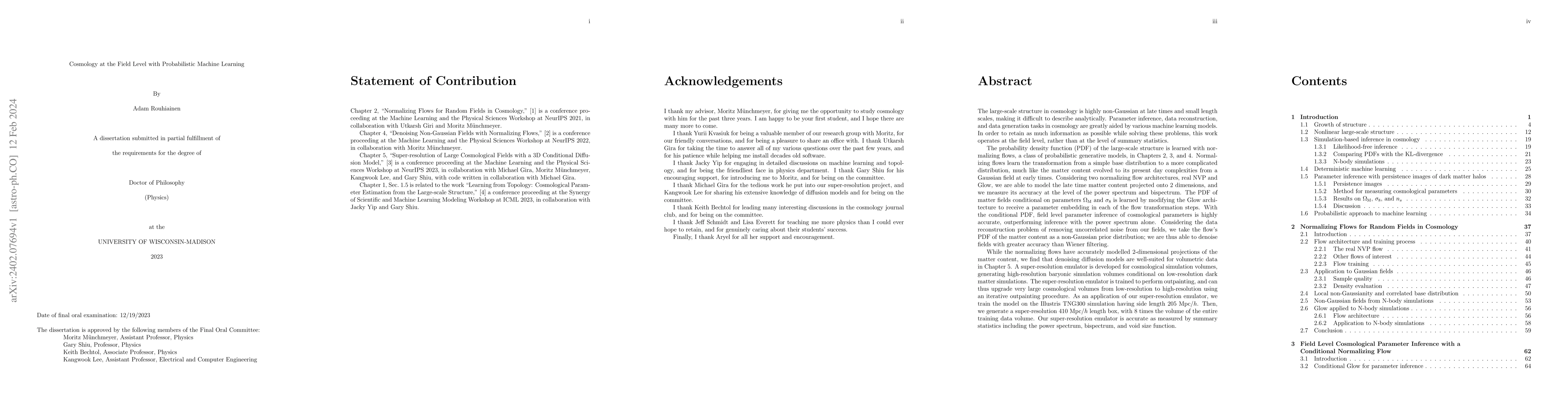 The large-scale structure in cosmology is highly non-Gaussian at late times and small length scales, making it difficult to describe analytically. Parameter inference, data reconstruction, and data generation tasks in cosmology are greatly aided by various machine learning models. In order to retain as much information as possible while solving these problems, this work operates at the field level, rather than at the level of summary statistics. The probability density function of the large-scale structure is learned with normalizing flows, a class of probabilistic generative models. Normalizing flows learn the transformation from a simple base distribution to a more complicated distribution, much like the matter content evolved to its present day complexities from a Gaussian field at early times. While the normalizing flows have accurately modelled 2-dimensional projections of the matter content, we find that denoising diffusion models are well-suited for volumetric data. A super-resolution emulator is developed for cosmological simulation volumes, generating high-resolution baryonic simulation volumes conditional on low-resolution dark matter simulations. The super-resolution emulator is trained to perform outpainting, and can thus upgrade very large cosmological volumes from low-resolution to high-resolution using an iterative outpainting procedure.