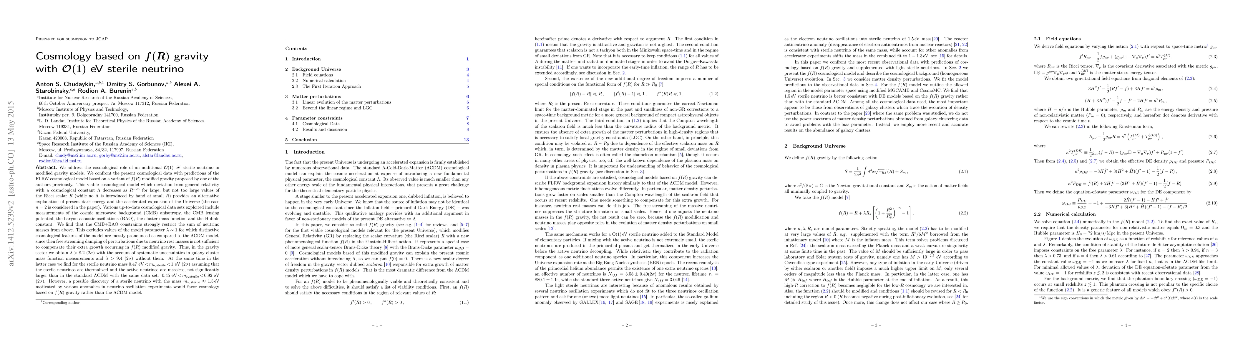 This paper explores the cosmological implications of an ${\cal O}(1)$ eV sterile neutrino within the framework of $f(R)$ modified gravity, finding that it provides an alternative explanation for dark energy and accelerated expansion. The study concludes that the sterile neutrino mass lies between 0.47 eV and 1 eV, with a preference for $f(R)$ gravity if the sterile neutrino mass is around 1.5 eV, as suggested by neutrino oscillation anomalies.