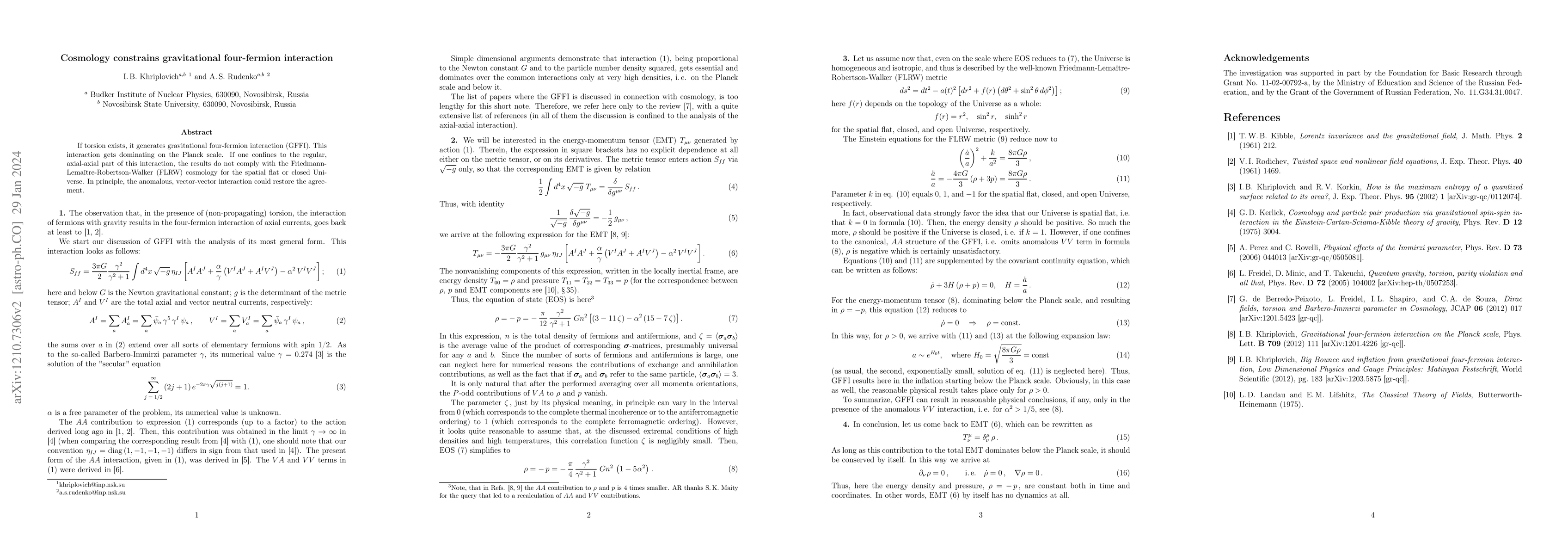 This paper investigates gravitational four-fermion interactions (GFFI) arising from torsion, which dominate at the Planck scale. It finds that the regular axial-axial part of GFFI conflicts with FLRW cosmology for flat or closed universes, but suggests that an anomalous vector-vector interaction might reconcile these discrepancies.