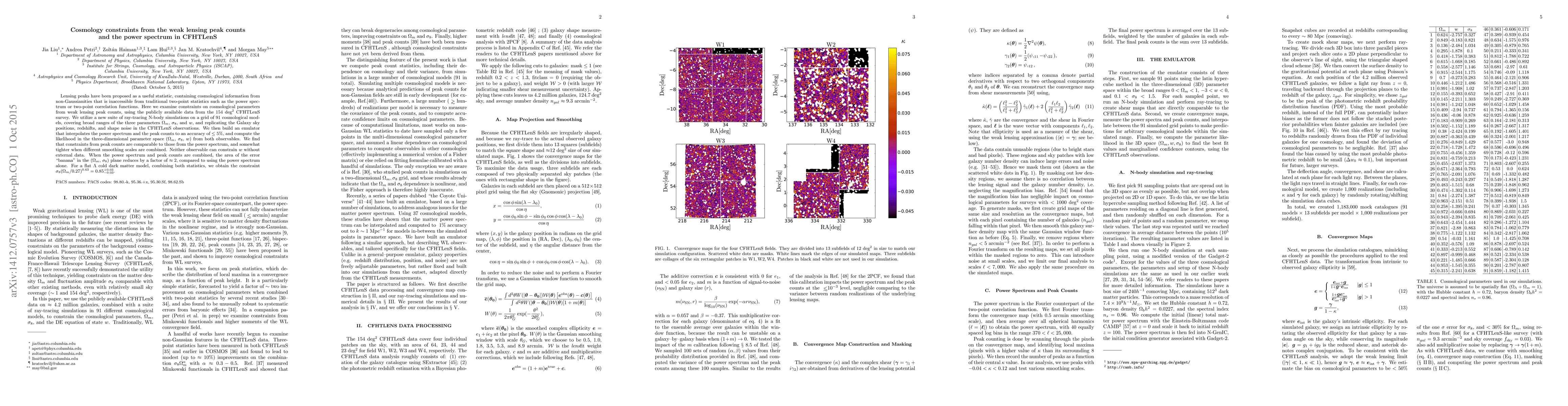 This paper investigates cosmological constraints from weak lensing peak counts using CFHTLenS data, comparing them to the traditional power spectrum. The study finds that peak counts provide comparable constraints to the power spectrum and improve parameter estimation when combined, reducing the error in the ($\Omega_m$, $\sigma_8$) plane by a factor of $\approx2$.