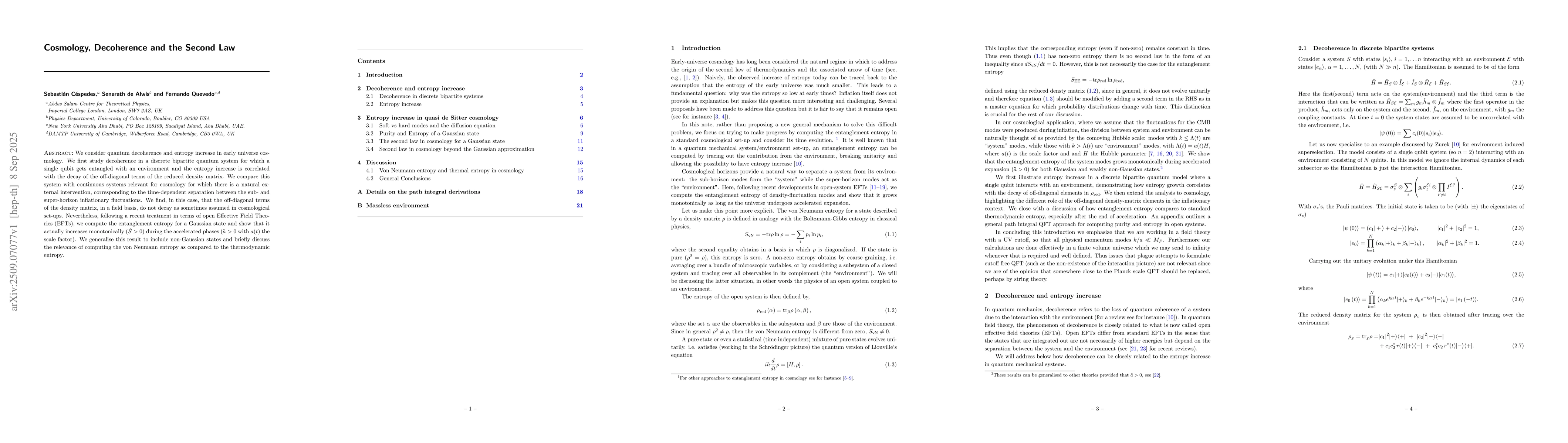 We consider quantum decoherence and entropy increase in early universe cosmology. We first study decoherence in a discrete bipartite quantum system for which a single qubit gets entangled with an environment and the entropy increase is correlated with the decay of the off-diagonal terms of the reduced density matrix. We compare this system with continuous systems relevant for cosmology for which there is a natural external intervention, corresponding to the time-dependent separation between the sub- and super-horizon inflationary fluctuations. We find, in this case, that the off-diagonal terms of the density matrix, in a field basis, do not decay as sometimes assumed in cosmological set-ups. Nevertheless, following a recent treatment in terms of open Effective Field Theories (EFTs), we compute the entanglement entropy for a Gaussian state and show that it actually increases monotonically ($\dot S>0$) during the accelerated phases ($\ddot a>0$ with $a(t)$ the scale factor). We generalise this result to include non-Gaussian states and briefly discuss the relevance of computing the von Neumann entropy as compared to the thermodynamic entropy.
