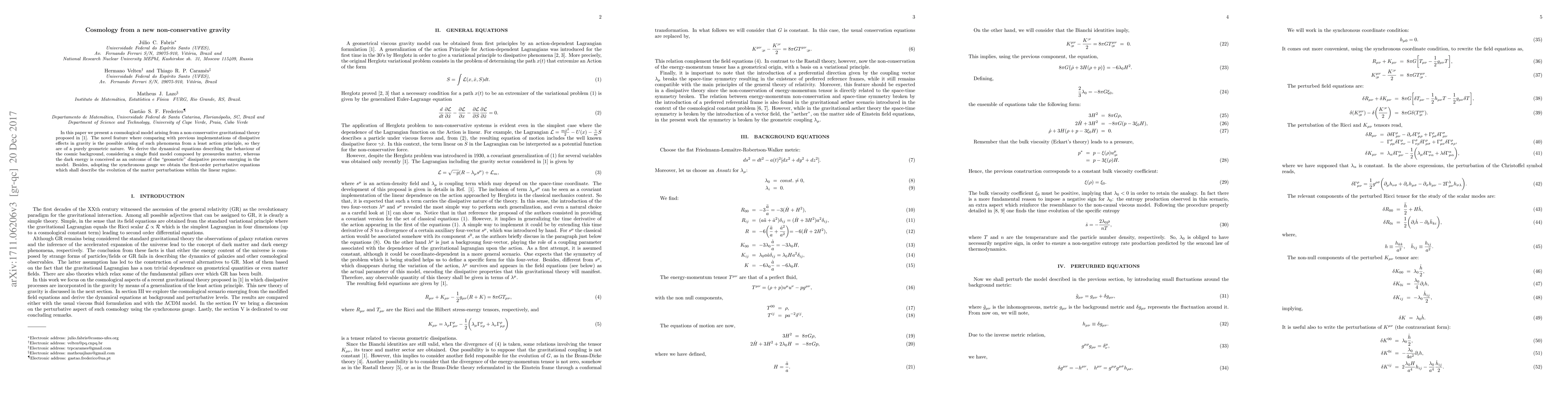 In this paper we present a cosmological model arising from a non-conservative gravitational theory proposed in [PRD 95, 101501(R) (2017)]. The novel feature where comparing with previous implementations of dissipative effects in gravity is the possible arising of such phenomena from a least action principle, so they are of a purely geometric nature. We derive the dynamical equations describing the behaviour of the cosmic background, considering a single fluid model composed by pressureles matter, whereas the dark energy is conceived as an outcome of the "geometric" dissipative process emerging in the model. Besides, adopting the synchronous gauge we obtain the first-order perturbative equations which shall describe the evolution of the matter perturbations within the linear regime.
