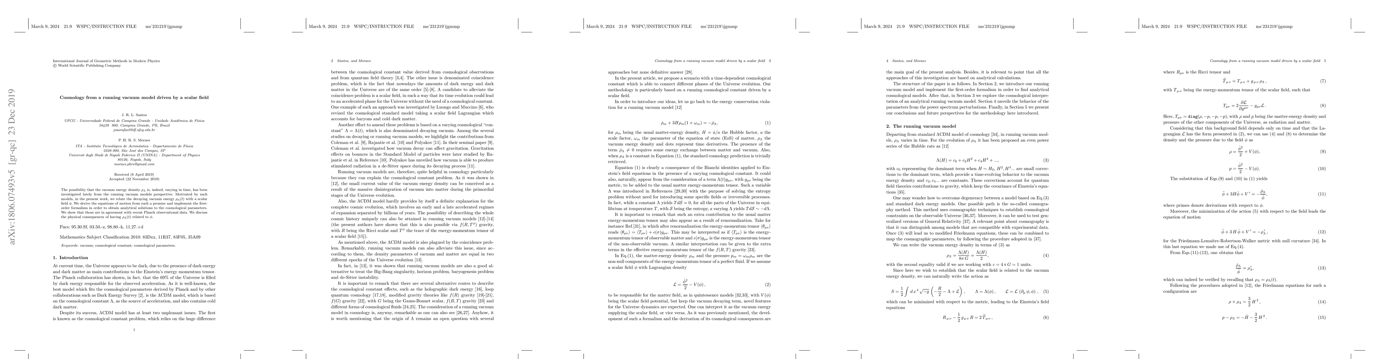 The possibility that the vacuum energy density $\rho_\Lambda$ is, indeed, varying in time, has been investigated lately from the running vacuum models perspective. Motivated by such models, in the present work, we relate the decaying vacuum energy $\rho_\Lambda(t)$ with a scalar field $\phi$. We derive the equations of motion from such a premise and implement the first-order formalism in order to obtain analytical solutions to the cosmological parameters. We show that those are in agreement with recent Planck observational data. We discuss the physical consequences of having $\rho_\Lambda(t)$ related to $\phi$.