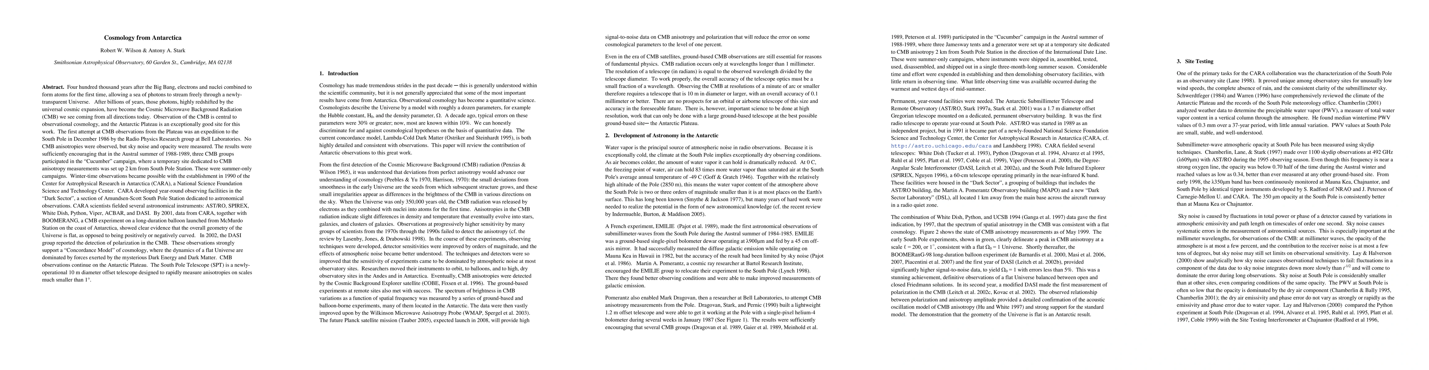 Observation of the CMB is central to observational cosmology, and the Antarctic Plateau is an exceptionally good site for this work. The first attempt at CMB observations from the Plateau was an expedition to the South Pole in December 1986 by the Radio Physics Research group at Bell Laboratories. Sky noise and opacity were measured. The results were sufficiently encouraging that in the Austral summer of 1988-1989, three CMB groups participated in the "Cucumber" campaign, where a temporary site dedicated to CMB anisotropy measurements was set up 2 km from South Pole Station. Winter-time observations became possible with the establishment in 1990 of the Center for Astrophysical Research in Antarctica (CARA), a National Science Foundation Science and Technology Center. CARA developed year-round observing facilities in the "Dark Sector", a section of Amundsen-Scott South Pole Station dedicated to astronomical observations. CARA scientists fielded several astronomical instruments: AST/RO, SPIREX, White Dish, Python, Viper, ACBAR, and DASI. By 2001, data from CARA, together with BOOMERANG, a CMB experiment on a long-duration balloon launched from McMurdo Station on the coast of Antarctica, showed clear evidence that the overall geometry of the Universe is flat, as opposed to being positively or negatively curved. In 2002, the DASI group reported the detection of polarization in the CMB. These observations strongly support the concordance model of cosmology, where the dynamics of a flat Universe are dominated by forces exerted by the Dark Energy and Dark Matter. The South Pole Telescope (SPT) is a newly-operational 10 m diameter offset telescope designed to rapidly measure anisotropies on scales much smaller than 1 degree.